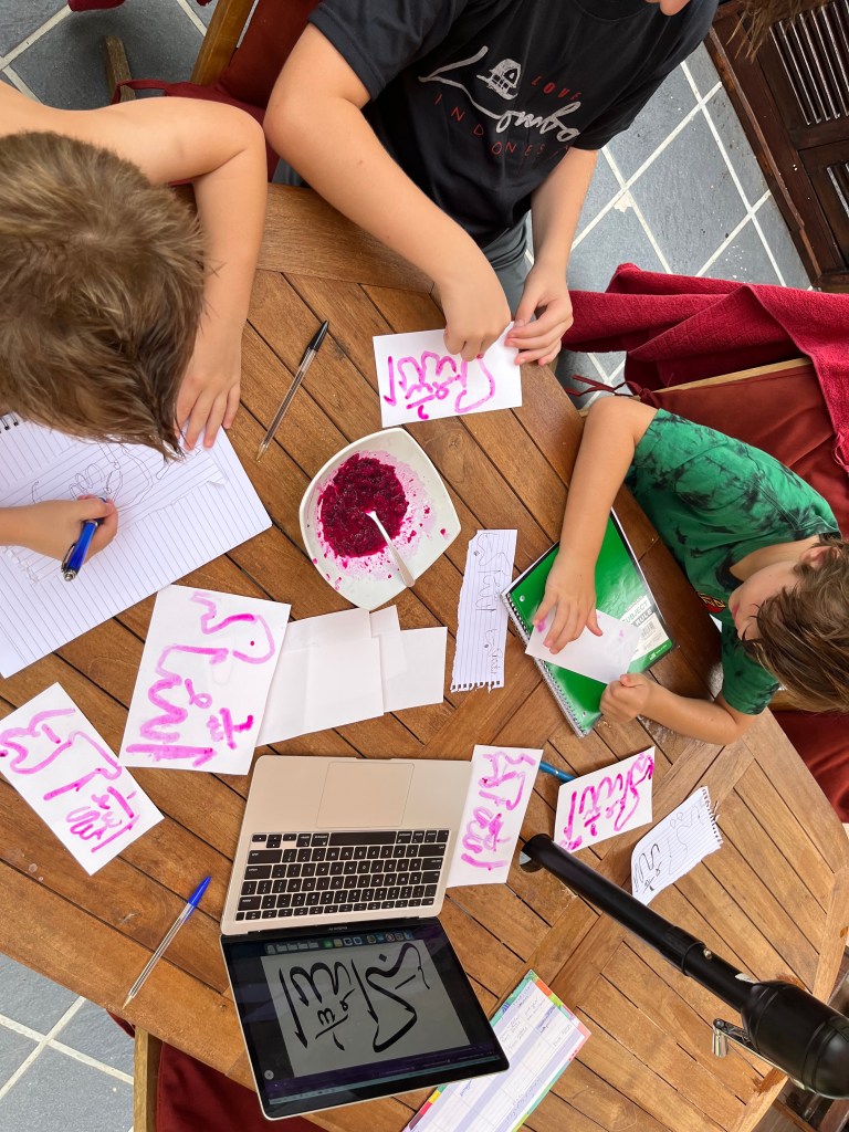 I remember this one from world religion classes. All Muslims must proclaim, “There is no God by Allah, and Mohammed is his prophet.” (Or a similar translation.) To get the boys interested in this one, I had to get a little creative. After checking that it was okay for us to artfully depict the name of Allah, we sat down to practice our Arabic script. In the absence of paint, I mashed some dragonfruit and set the boys to finger painting “Allah” in pink juice. If we did this with respect, apparently, it’s okay. (No doubt, for some, this is crossing over a line. Apologies. You can see from their faces they were considerate, and our purpose was educational.)