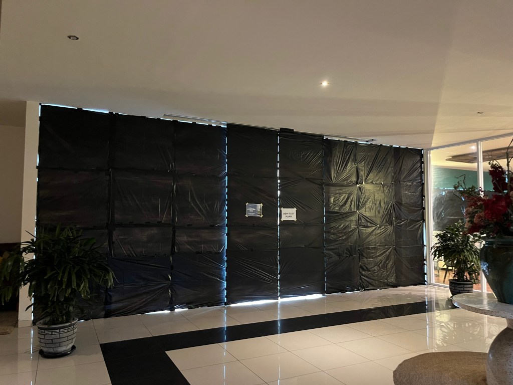 The use of electricity, technology, or any entertainment is prohibited. There are no working channels on the tv. Apparently, the island goes completely dark at night as the people cannot even light fires. We just got a call to our room and then a room visit from staff to inspect our curtains because security was reporting light escaping from our window. You aren’t even supposed to open your blinds in the day time to let the sun inside. We are not allowed to walk around or even leave the hotel. (See photos of the glass door entrance below.) There are police patrolling to enforce this observance. I can see them from our window when I sneak a peek out of the pinned-shut curtains. The only movement out there this morning was a dog wandering in the middle of the highway, no doubt in a state of canine apocalyptic confusion.