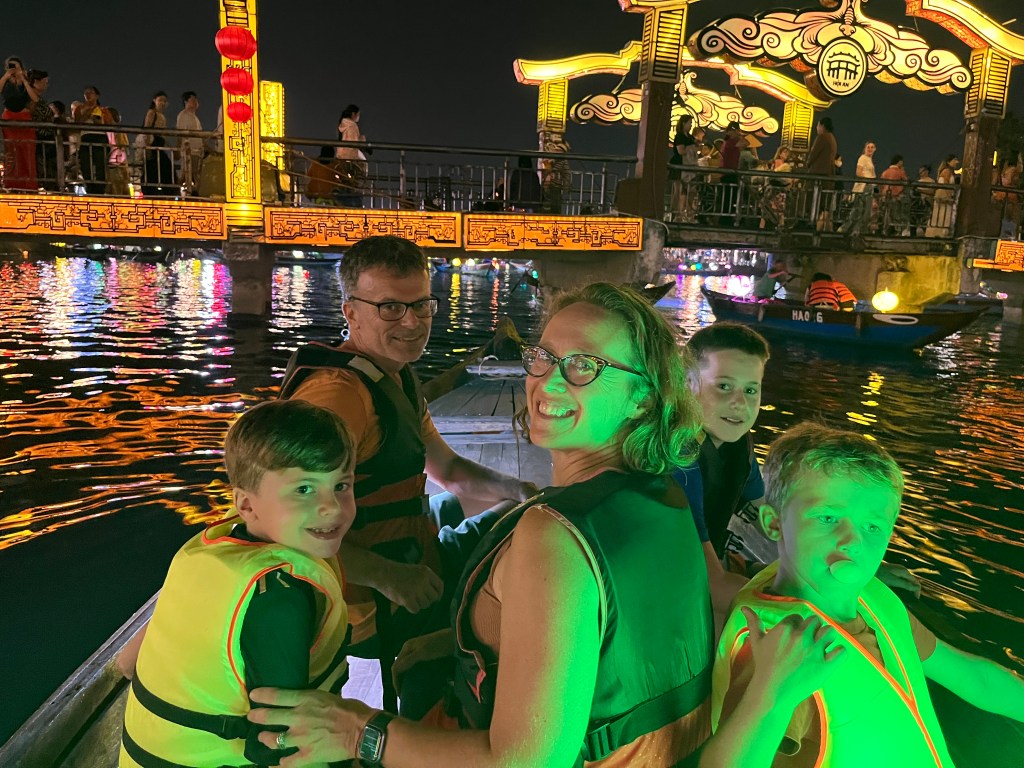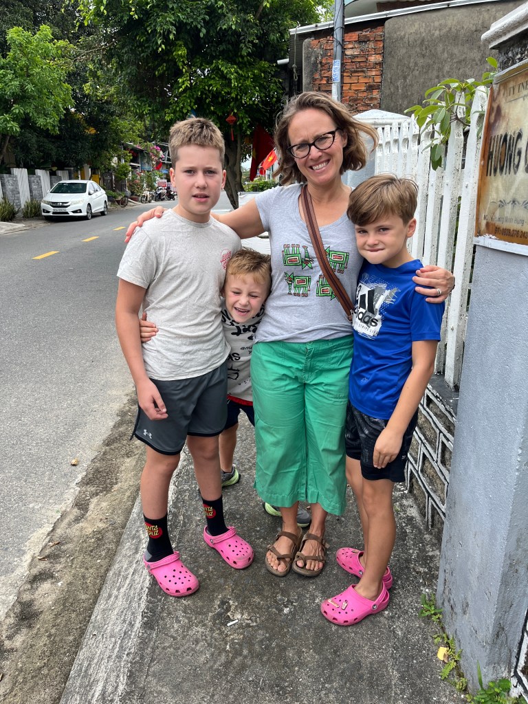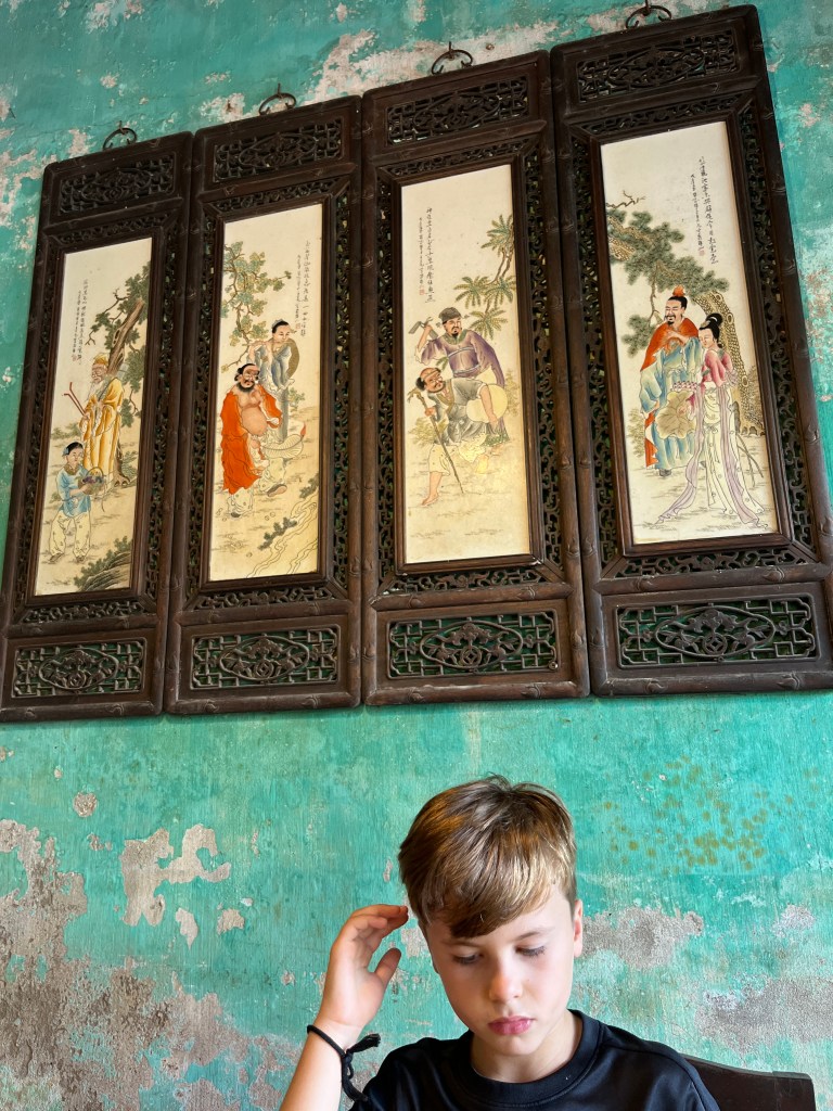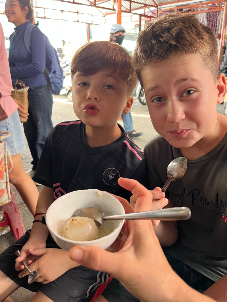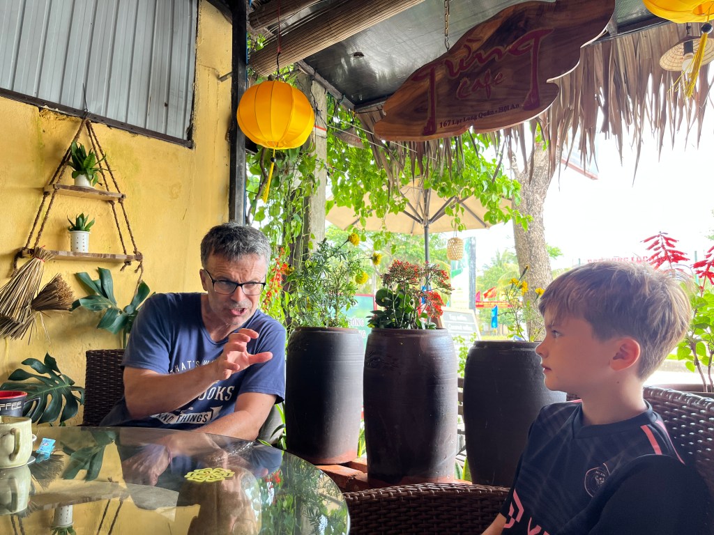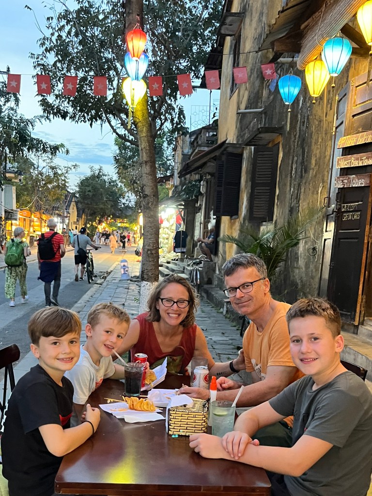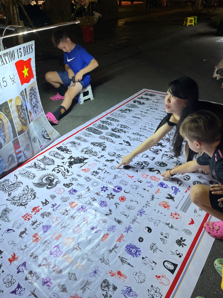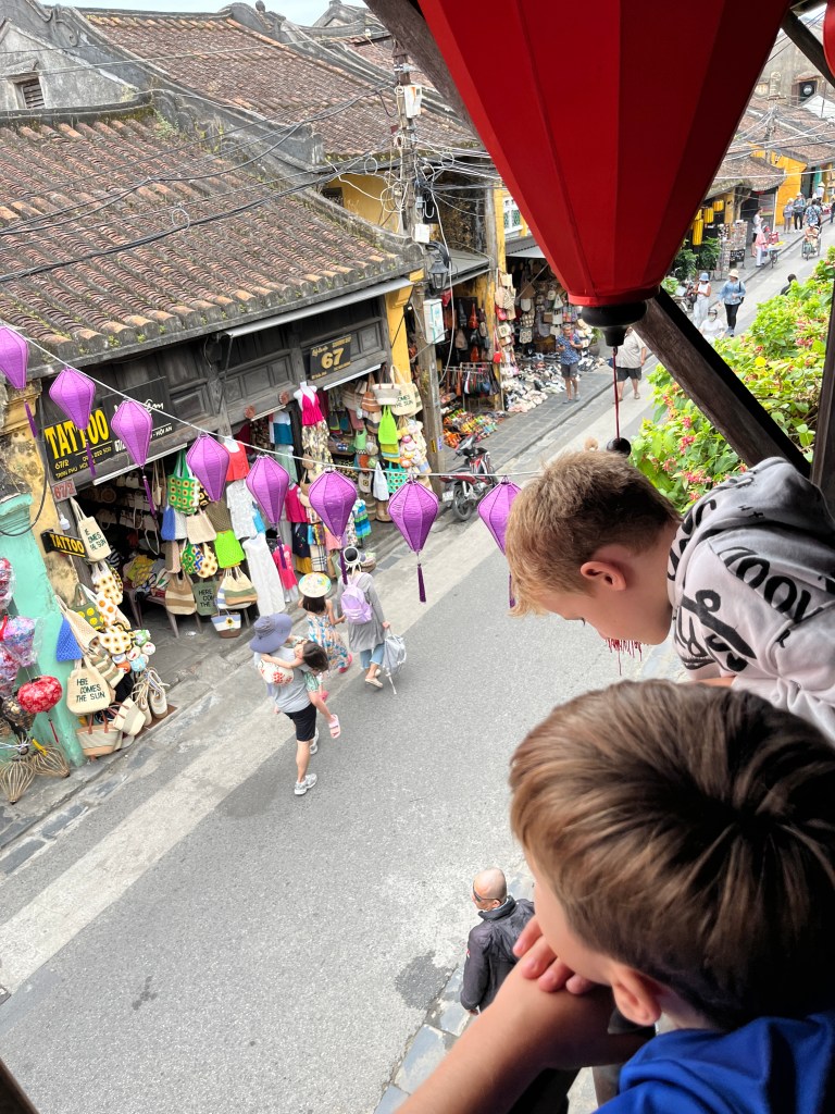 The Art of Coffee – Vietnamese Coffee Culture is not part of the late 20th century coffee craze. It’s its own thing, started in the 1850s with French colonial influence. Salt Coffee is my fav, but Egg Coffee was invented in Hanoi in the 1946 by a bartender looking for a milk substitute during a shortage. Now, it’s everywhere.Old Town’s lanterns are the epitome of Vietnam’s charm.Always suckers for glowing, flying things.Releasing a floating lantern is supposed to bring good luck. They use these little baskets on a stick to lower them into the river.Hanging in an OIt’s a dream-like atmosphere… if you can close your ears to the chaos. By BoatWe did worry about polluting the river, so we didn’t buy any lanterns, but we were handed a couple by our boatman.There has been a bit of an obsession developing around tattoos, so the boys each got a henna one.The eldest took a video-editing workshop from an Italian world-schooling teenager. It was great, and now he is making his own videos and exploring new features and concepts.15 Years MarriedA South African man, who now lives in the Granite Hills in Australia, has a wine bar with a nice variety of wines and a killer cheese platter. (I so miss cheese.) Seemed a good choice for a sneak-off anniversary happy hour.Waiting for a Grab ride. This “ride-hailing” app is such a game-changer for travellers. Much like Uber, you don’t have to have cash or physically find a driver. You don’t have to worry about change or negotiations or being over-charged. It’s made running around Hoi An so much easier as a parent. The driver usually arrives in about two minutes. So grateful for this development. (This photo was actually taken because I think my journey to being shortest member of the family is speeding up. I’ll be passed soon.)Just a house on our little lane, stylin’ their own funky style. I love it.This yellow is the colour of almost all the buildings in Old Town. They wear their patterns of age with such panache and truth, more beautiful for their ownership of these markings of Time.Thich Nhat Hanh, Buddhist monk and peace advocate, is from Vietnam. He wrote the book No Mud, No Lotus: The Art of Transforming Suffering. I think of this a lot.While I used to see my boys hunched over in the hypnosis of screens, now I see them hunched over in curiosity for life. Such a win. No words.It’s all a feast for the senses. This coffee is special. It’s Weasel Coffee, or Kopi Luwak. These weasels, Asian Palm Civets, eat the coffee fruit, and then poo them out, their digestive enzymes having dissolved the pulpy casings, leaving the bean intact. After being thoroughly cleaned (we hope), the coffee is supposed to have an extra smooth taste. The little one was not impress with this bowl of weasel poo. The older two took a survival course which involved shelter-making and fire-starting. Yes, we paid for this.They also had a raft-building competition. The boys were impressed with the kids who had sailed for a year and could tie knots without looking. Then they raced the rafts. The middle one’s won.There was an afternoon of water play, including paddle boarding and a ropes course that the little one joined in on. Maybe I should feel bad, but I take great joy in watching these hell-raisers strain and struggle and then plop in the water. Am I not supposed to share that? Reverence for Ho Chi Minh, The Great Leader. This month, on April 30th, the country will celebrate the 50-year anniversary of “Reunification” after Vietnam’s civil war. Interestingly, we will arrive in Hanoi on this day. The Vietnam Military History Museum there claims to offer “deep insight into Vietnam’s great victory against French colonialists and American imperialists.” I can’t wait to take the boys.Goldfish in a cafe table. I think this is Worldschooling in action. Not sure. (Neither is the boy.)I miss teaching English and defining the edges of usage and meaning. We had a good laugh about this message from our Hanoi AirB&B host. You cannot say one “must try” the airport transfer. And “2-way shipping” of laundry is just not quite right. I just love what is revealed by misusage. School at our place.The office this month. With a riverview!We’ve had our first illness. Poor Dad. Luckily (I think), the pharmacy gave him some antibiotics over the counter. Not a great practice in general, but hopefully an easy fix for us. (grimace) This decongestant may be helpful too?StreetfoodMagic Hour in photography is just after dawn and just before sunset, when the light is soft and golden. Hoi An, with its lanterns and market lights, must be one of the best places in the world to enjoy this.Of course, the one photo where all my people look great, I’ve got my eyes half-closed. Oh well. Memory captured.Talk about light-play.Ancestor worship altars are set up on the street and in homes and business (which are often one and the same). Offerings of flowers, food and drink are laid out. Incense and candles call deceased relatives to the table.This was our perch in Old Town to watch the world go by. We gave the boys small amounts of cash, and they had a blast bargaining at the night market. They kept running back, laughing out tales of their great bartering skills. A little game of balloon volleyball with local kids on the walk home from dinner.A popular Hoi An attraction is to take the coconut boats through the local “coconut forest.” The little one is resting his arm on one of the coconuts. Not the “coconut” you imagine. These plants make roofs, the classic Vietnamese hats, as well as many other products.We felt a bit guilty being paddled around by an elderly couple. They did give us a paddle to pitch in, eventually.Our guides, who spoke little English, were the parents of the owner of the restaurant that runs the boat tours and cooking classes. They were quite skilled in making various charming forms from the palms.Rockin’ the Palm FashionThis is the moment I 