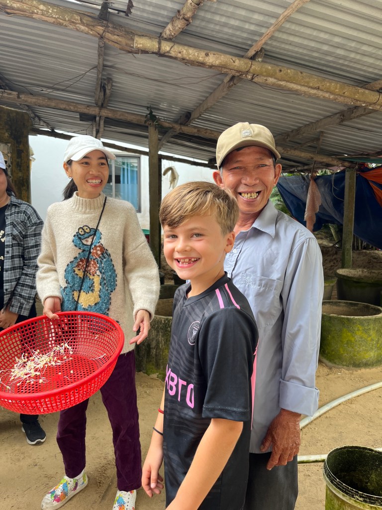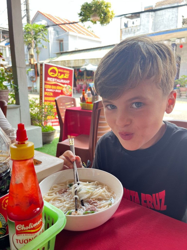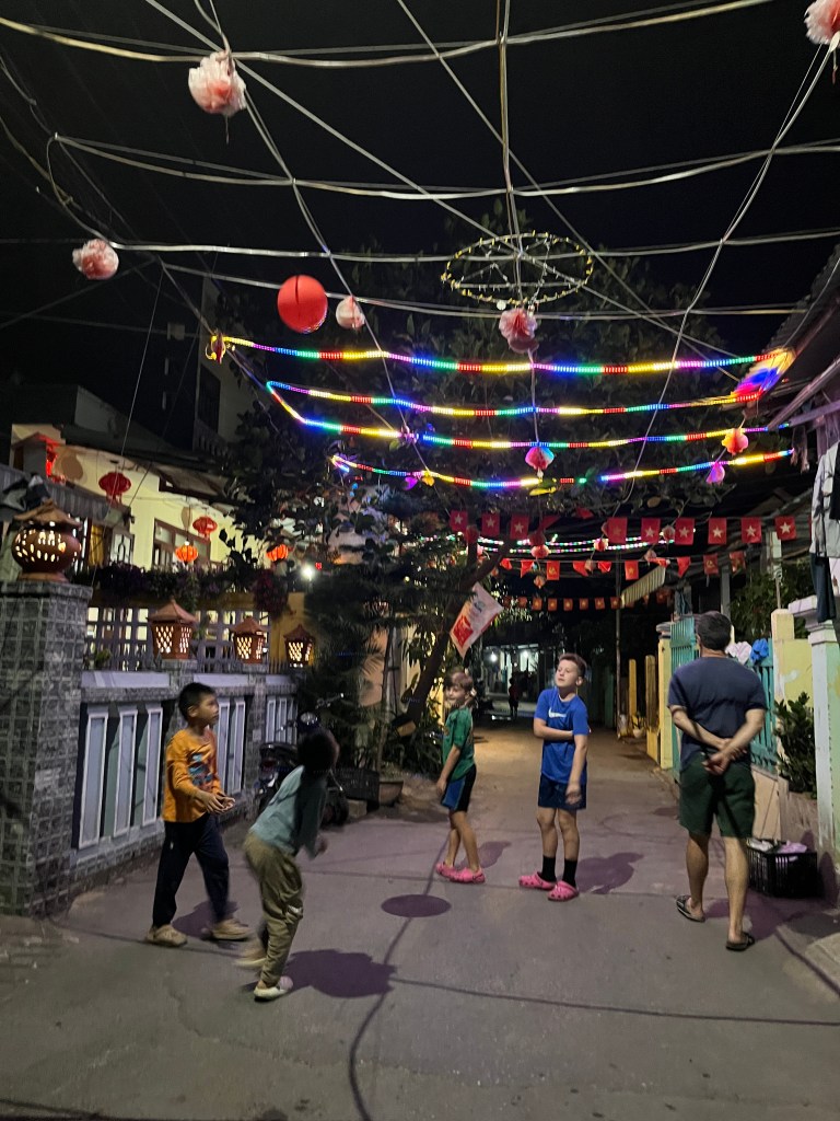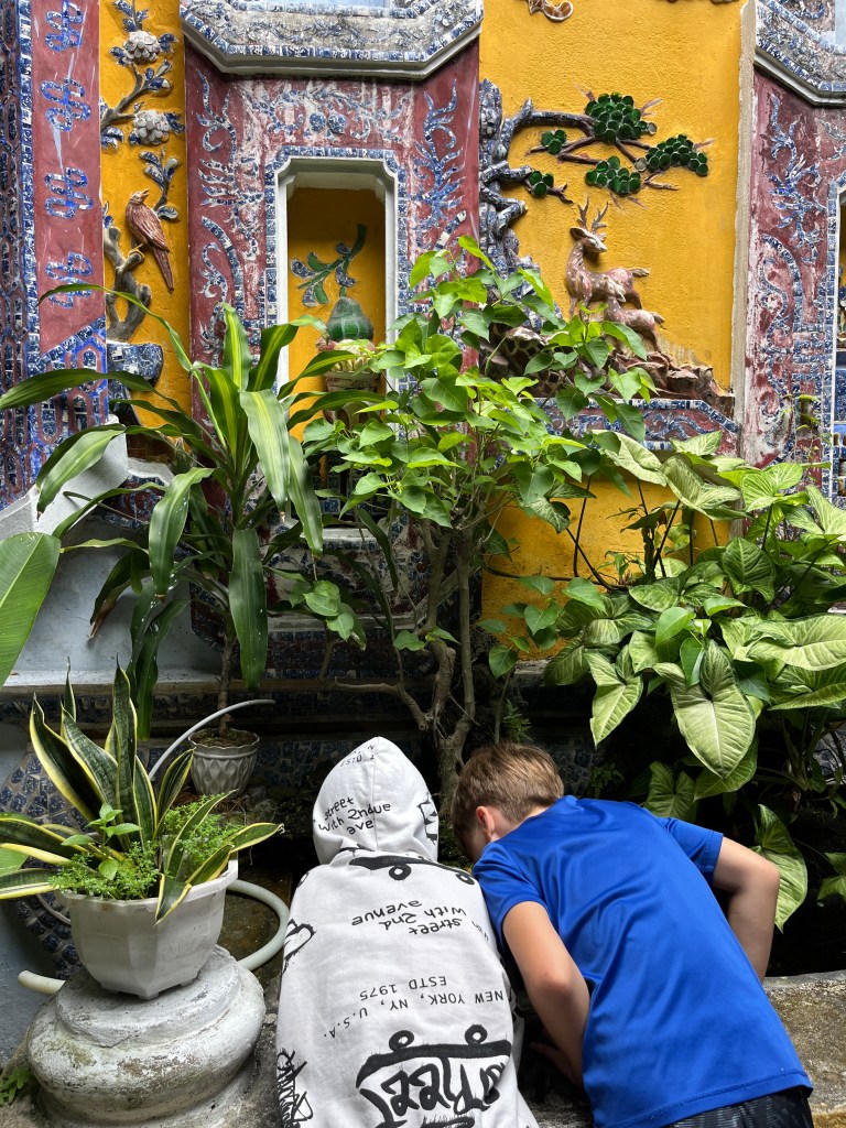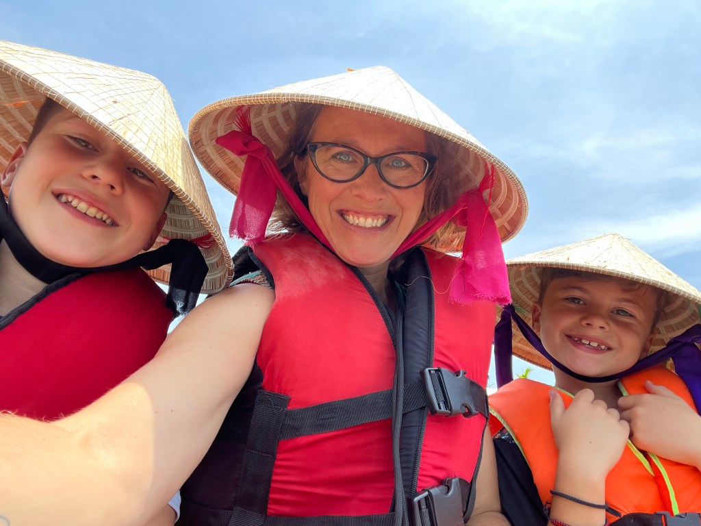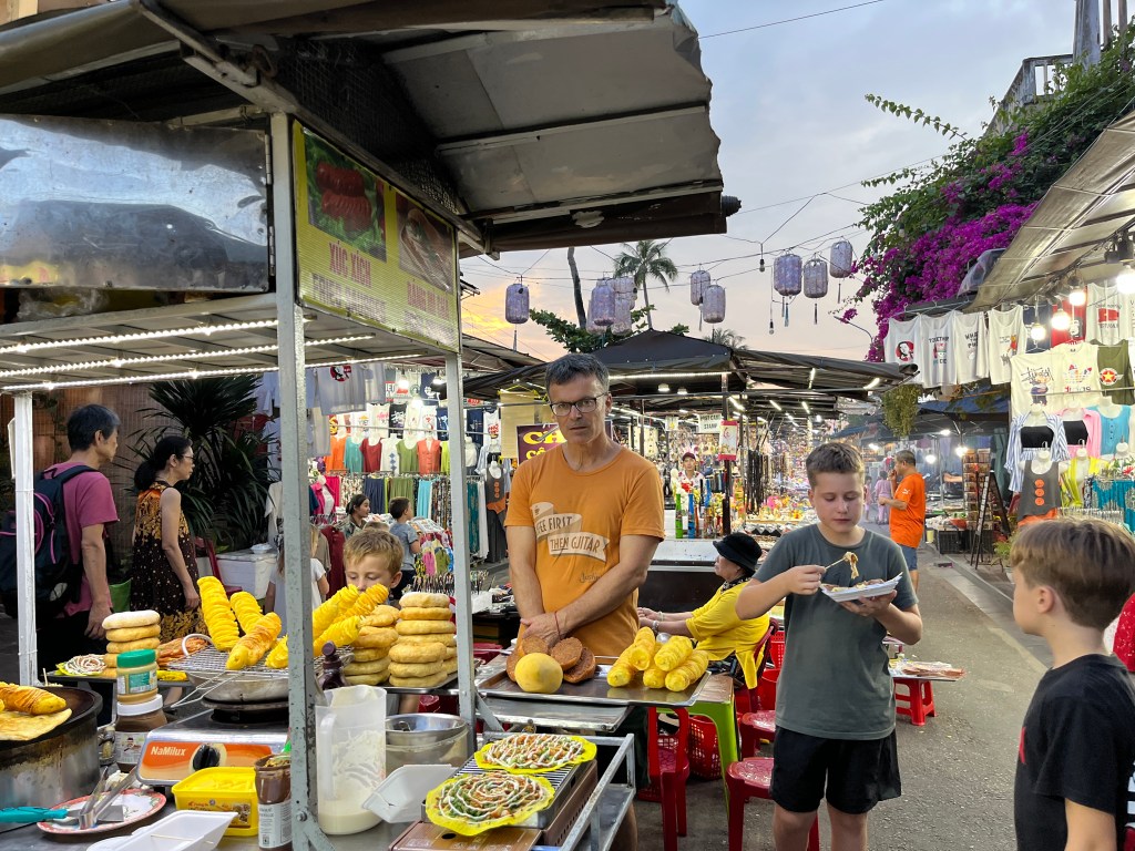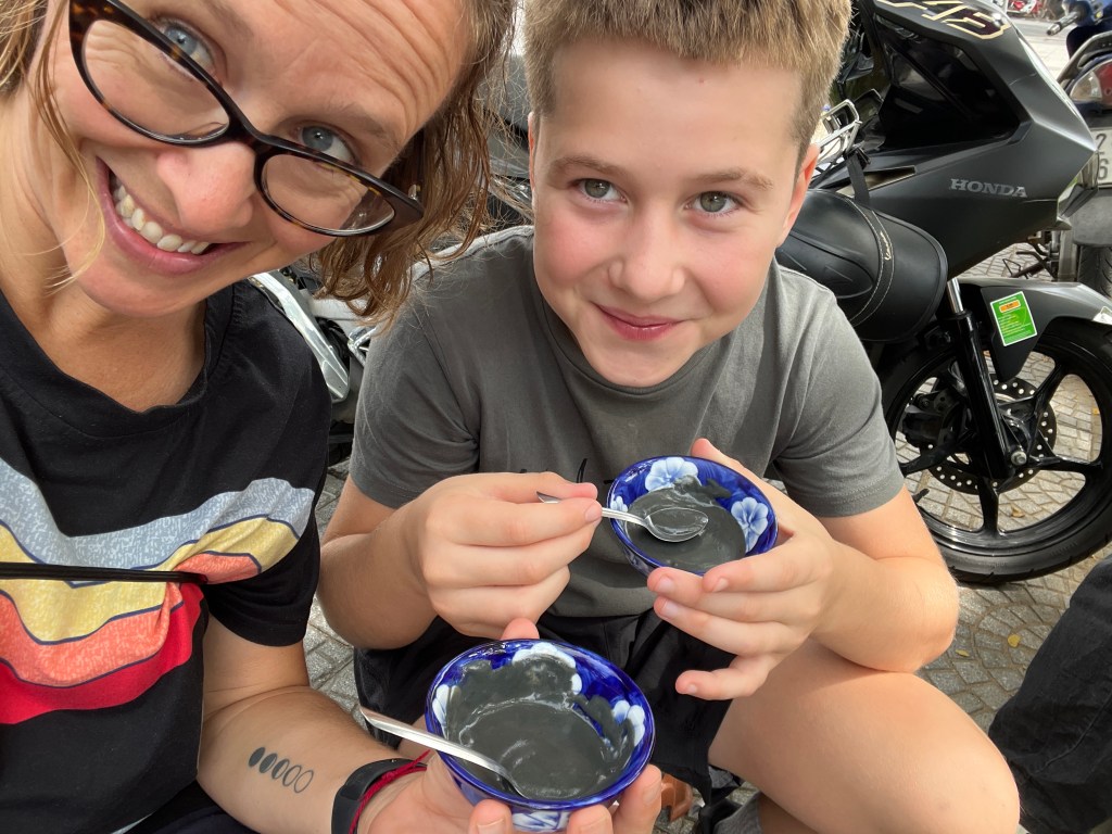 The Art of Coffee – Vietnamese Coffee Culture is not part of the late 20th century coffee craze. It’s its own thing, started in the 1850s with French colonial influence. Salt Coffee is my fav, but Egg Coffee was invented in Hanoi in the 1946 by a bartender looking for a milk substitute during a shortage. Now, it’s everywhere.Old Town’s lanterns are the epitome of Vietnam’s charm.Always suckers for glowing, flying things.Releasing a floating lantern is supposed to bring good luck. They use these little baskets on a stick to lower them into the river.Hanging in an OIt’s a dream-like atmosphere… if you can close your ears to the chaos. By BoatWe did worry about polluting the river, so we didn’t buy any lanterns, but we were handed a couple by our boatman.There has been a bit of an obsession developing around tattoos, so the boys each got a henna one.The eldest took a video-editing workshop from an Italian world-schooling teenager. It was great, and now he is making his own videos and exploring new features and concepts.15 Years MarriedA South African man, who now lives in the Granite Hills in Australia, has a wine bar with a nice variety of wines and a killer cheese platter. (I so miss cheese.) Seemed a good choice for a sneak-off anniversary happy hour.Waiting for a Grab ride. This “ride-hailing” app is such a game-changer for travellers. Much like Uber, you don’t have to have cash or physically find a driver. You don’t have to worry about change or negotiations or being over-charged. It’s made running around Hoi An so much easier as a parent. The driver usually arrives in about two minutes. So grateful for this development. (This photo was actually taken because I think my journey to being shortest member of the family is speeding up. I’ll be passed soon.)Just a house on our little lane, stylin’ their own funky style. I love it.This yellow is the colour of almost all the buildings in Old Town. They wear their patterns of age with such panache and truth, more beautiful for their ownership of these markings of Time.Thich Nhat Hanh, Buddhist monk and peace advocate, is from Vietnam. He wrote the book No Mud, No Lotus: The Art of Transforming Suffering. I think of this a lot.While I used to see my boys hunched over in the hypnosis of screens, now I see them hunched over in curiosity for life. Such a win. No words.It’s all a feast for the senses. This coffee is special. It’s Weasel Coffee, or Kopi Luwak. These weasels, Asian Palm Civets, eat the coffee fruit, and then poo them out, their digestive enzymes having dissolved the pulpy casings, leaving the bean intact. After being thoroughly cleaned (we hope), the coffee is supposed to have an extra smooth taste. The little one was not impress with this bowl of weasel poo. The older two took a survival course which involved shelter-making and fire-starting. Yes, we paid for this.They also had a raft-building competition. The boys were impressed with the kids who had sailed for a year and could tie knots without looking. Then they raced the rafts. The middle one’s won.There was an afternoon of water play, including paddle boarding and a ropes course that the little one joined in on. Maybe I should feel bad, but I take great joy in watching these hell-raisers strain and struggle and then plop in the water. Am I not supposed to share that? Reverence for Ho Chi Minh, The Great Leader. This month, on April 30th, the country will celebrate the 50-year anniversary of “Reunification” after Vietnam’s civil war. Interestingly, we will arrive in Hanoi on this day. The Vietnam Military History Museum there claims to offer “deep insight into Vietnam’s great victory against French colonialists and American imperialists.” I can’t wait to take the boys.Goldfish in a cafe table. I think this is Worldschooling in action. Not sure. (Neither is the boy.)I miss teaching English and defining the edges of usage and meaning. We had a good laugh about this message from our Hanoi AirB&B host. You cannot say one “must try” the airport transfer. And “2-way shipping” of laundry is just not quite right. I just love what is revealed by misusage. School at our place.The office this month. With a riverview!We’ve had our first illness. Poor Dad. Luckily (I think), the pharmacy gave him some antibiotics over the counter. Not a great practice in general, but hopefully an easy fix for us. (grimace) This decongestant may be helpful too?StreetfoodMagic Hour in photography is just after dawn and just before sunset, when the light is soft and golden. Hoi An, with its lanterns and market lights, must be one of the best places in the world to enjoy this.Of course, the one photo where all my people look great, I’ve got my eyes half-closed. Oh well. Memory captured.Talk about light-play.Ancestor worship altars are set up on the street and in homes and business (which are often one and the same). Offerings of flowers, food and drink are laid out. Incense and candles call deceased relatives to the table.This was our perch in Old Town to watch the world go by. We gave the boys small amounts of cash, and they had a blast bargaining at the night market. They kept running back, laughing out tales of their great bartering skills. A little game of balloon volleyball with local kids on the walk home from dinner.A popular Hoi An attraction is to take the coconut boats through the local “coconut forest.” The little one is resting his arm on one of the coconuts. Not the “coconut” you imagine. These plants make roofs, the classic Vietnamese hats, as well as many other products.We felt a bit guilty being paddled around by an elderly couple. They did give us a paddle to pitch in, eventually.Our guides, who spoke little English, were the parents of the owner of the restaurant that runs the boat tours and cooking classes. They were quite skilled in making various charming forms from the palms.Rockin’ the Palm FashionThis is the moment I 
