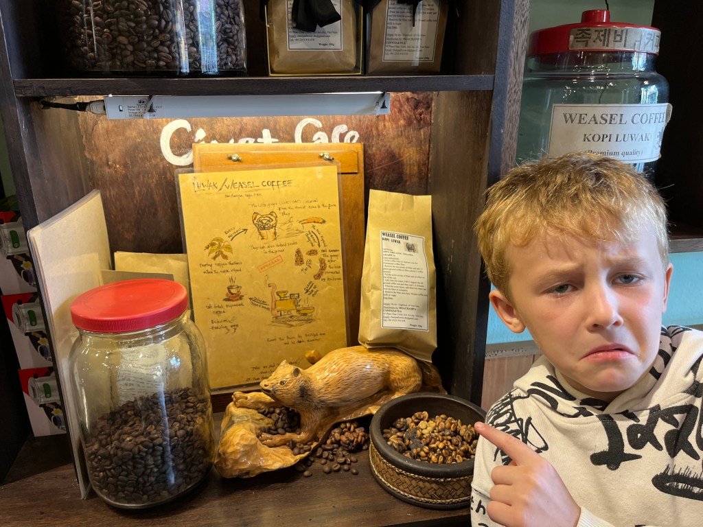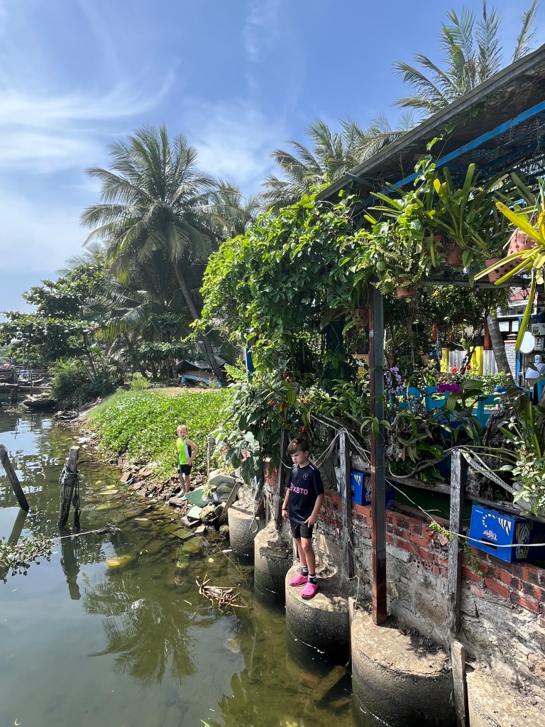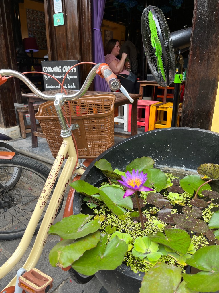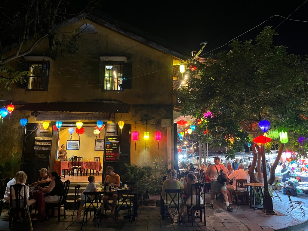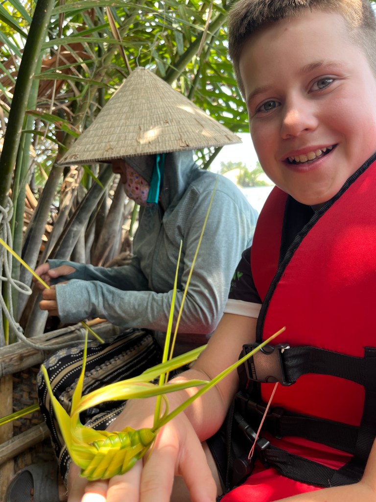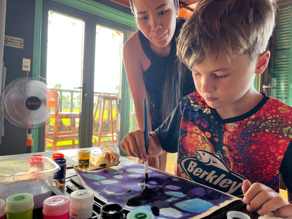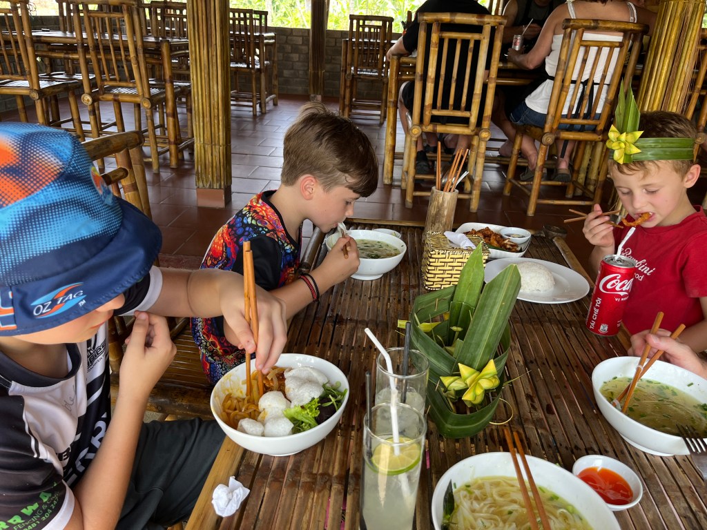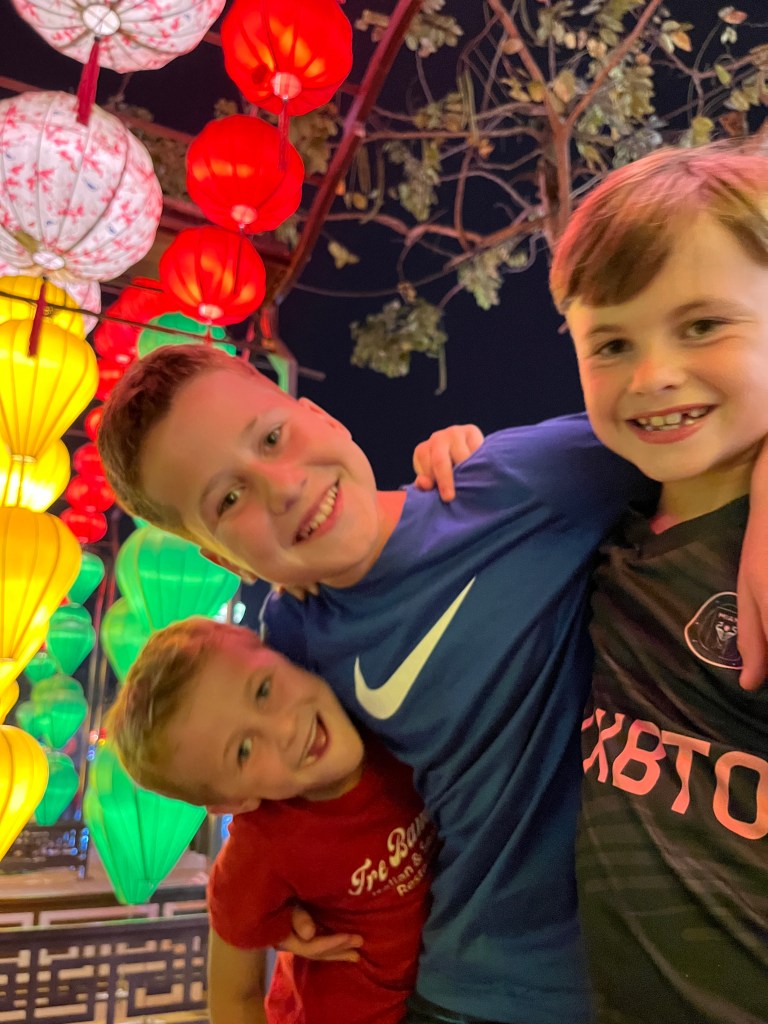 The Art of Coffee – Vietnamese Coffee Culture is not part of the late 20th century coffee craze. It’s its own thing, started in the 1850s with French colonial influence. Salt Coffee is my fav, but Egg Coffee was invented in Hanoi in the 1946 by a bartender looking for a milk substitute during a shortage. Now, it’s everywhere.Old Town’s lanterns are the epitome of Vietnam’s charm.Always suckers for glowing, flying things.Releasing a floating lantern is supposed to bring good luck. They use these little baskets on a stick to lower them into the river.Hanging in an OIt’s a dream-like atmosphere… if you can close your ears to the chaos. By BoatWe did worry about polluting the river, so we didn’t buy any lanterns, but we were handed a couple by our boatman.There has been a bit of an obsession developing around tattoos, so the boys each got a henna one.The eldest took a video-editing workshop from an Italian world-schooling teenager. It was great, and now he is making his own videos and exploring new features and concepts.15 Years MarriedA South African man, who now lives in the Granite Hills in Australia, has a wine bar with a nice variety of wines and a killer cheese platter. (I so miss cheese.) Seemed a good choice for a sneak-off anniversary happy hour.Waiting for a Grab ride. This “ride-hailing” app is such a game-changer for travellers. Much like Uber, you don’t have to have cash or physically find a driver. You don’t have to worry about change or negotiations or being over-charged. It’s made running around Hoi An so much easier as a parent. The driver usually arrives in about two minutes. So grateful for this development. (This photo was actually taken because I think my journey to being shortest member of the family is speeding up. I’ll be passed soon.)Just a house on our little lane, stylin’ their own funky style. I love it.This yellow is the colour of almost all the buildings in Old Town. They wear their patterns of age with such panache and truth, more beautiful for their ownership of these markings of Time.Thich Nhat Hanh, Buddhist monk and peace advocate, is from Vietnam. He wrote the book No Mud, No Lotus: The Art of Transforming Suffering. I think of this a lot.While I used to see my boys hunched over in the hypnosis of screens, now I see them hunched over in curiosity for life. Such a win. No words.It’s all a feast for the senses. This coffee is special. It’s Weasel Coffee, or Kopi Luwak. These weasels, Asian Palm Civets, eat the coffee fruit, and then poo them out, their digestive enzymes having dissolved the pulpy casings, leaving the bean intact. After being thoroughly cleaned (we hope), the coffee is supposed to have an extra smooth taste. The little one was not impress with this bowl of weasel poo. The older two took a survival course which involved shelter-making and fire-starting. Yes, we paid for this.They also had a raft-building competition. The boys were impressed with the kids who had sailed for a year and could tie knots without looking. Then they raced the rafts. The middle one’s won.There was an afternoon of water play, including paddle boarding and a ropes course that the little one joined in on. Maybe I should feel bad, but I take great joy in watching these hell-raisers strain and struggle and then plop in the water. Am I not supposed to share that? Reverence for Ho Chi Minh, The Great Leader. This month, on April 30th, the country will celebrate the 50-year anniversary of “Reunification” after Vietnam’s civil war. Interestingly, we will arrive in Hanoi on this day. The Vietnam Military History Museum there claims to offer “deep insight into Vietnam’s great victory against French colonialists and American imperialists.” I can’t wait to take the boys.Goldfish in a cafe table. I think this is Worldschooling in action. Not sure. (Neither is the boy.)I miss teaching English and defining the edges of usage and meaning. We had a good laugh about this message from our Hanoi AirB&B host. You cannot say one “must try” the airport transfer. And “2-way shipping” of laundry is just not quite right. I just love what is revealed by misusage. School at our place.The office this month. With a riverview!We’ve had our first illness. Poor Dad. Luckily (I think), the pharmacy gave him some antibiotics over the counter. Not a great practice in general, but hopefully an easy fix for us. (grimace) This decongestant may be helpful too?StreetfoodMagic Hour in photography is just after dawn and just before sunset, when the light is soft and golden. Hoi An, with its lanterns and market lights, must be one of the best places in the world to enjoy this.Of course, the one photo where all my people look great, I’ve got my eyes half-closed. Oh well. Memory captured.Talk about light-play.Ancestor worship altars are set up on the street and in homes and business (which are often one and the same). Offerings of flowers, food and drink are laid out. Incense and candles call deceased relatives to the table.This was our perch in Old Town to watch the world go by. We gave the boys small amounts of cash, and they had a blast bargaining at the night market. They kept running back, laughing out tales of their great bartering skills. A little game of balloon volleyball with local kids on the walk home from dinner.A popular Hoi An attraction is to take the coconut boats through the local “coconut forest.” The little one is resting his arm on one of the coconuts. Not the “coconut” you imagine. These plants make roofs, the classic Vietnamese hats, as well as many other products.We felt a bit guilty being paddled around by an elderly couple. They did give us a paddle to pitch in, eventually.Our guides, who spoke little English, were the parents of the owner of the restaurant that runs the boat tours and cooking classes. They were quite skilled in making various charming forms from the palms.Rockin’ the Palm FashionThis is the moment I 