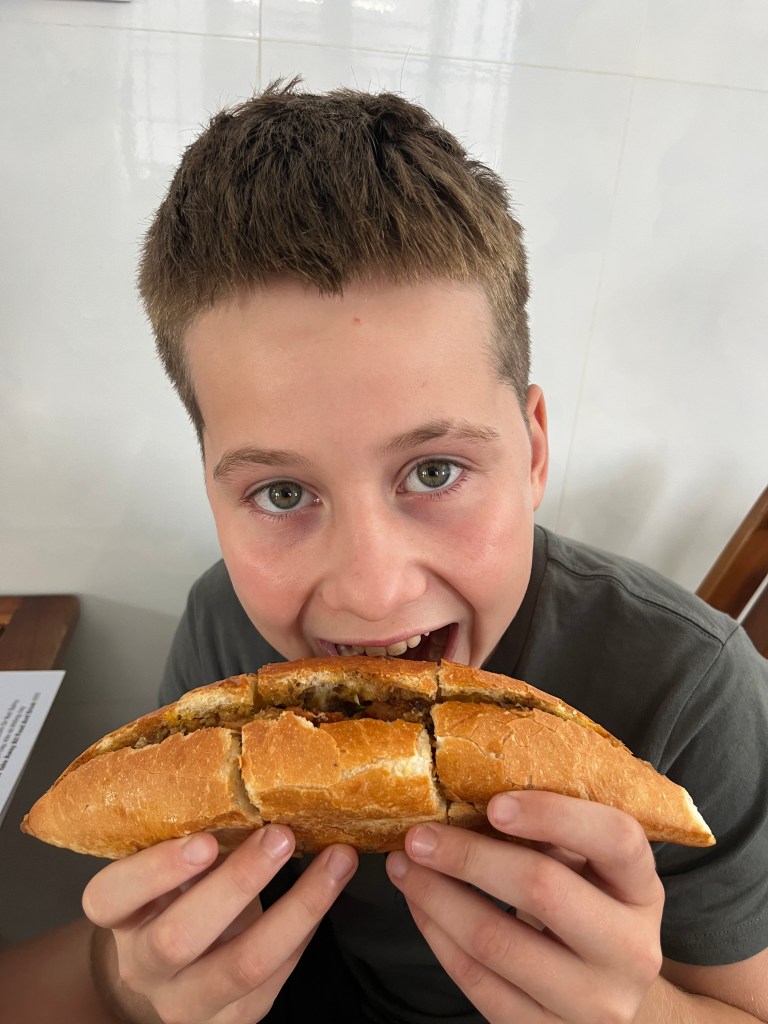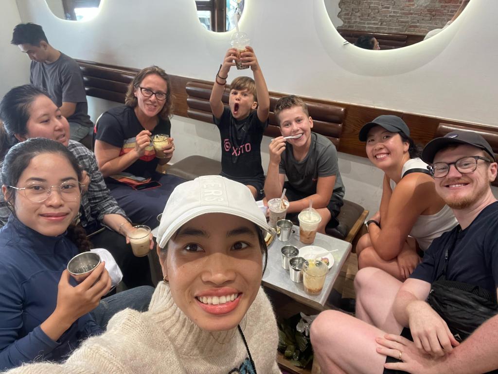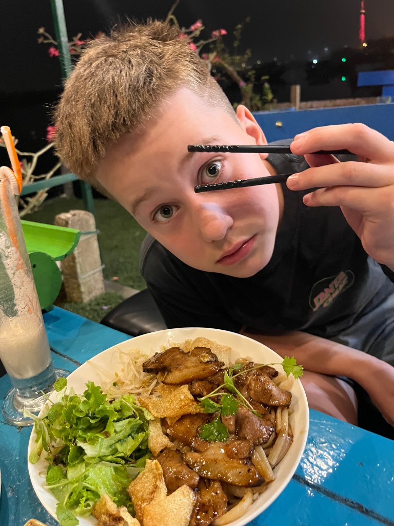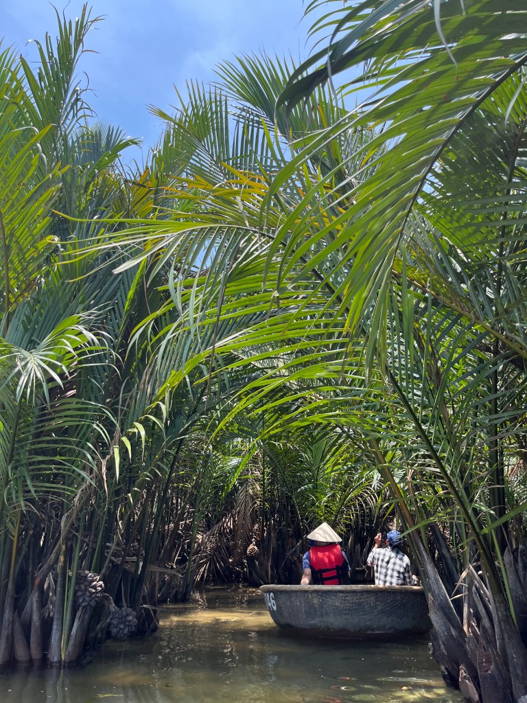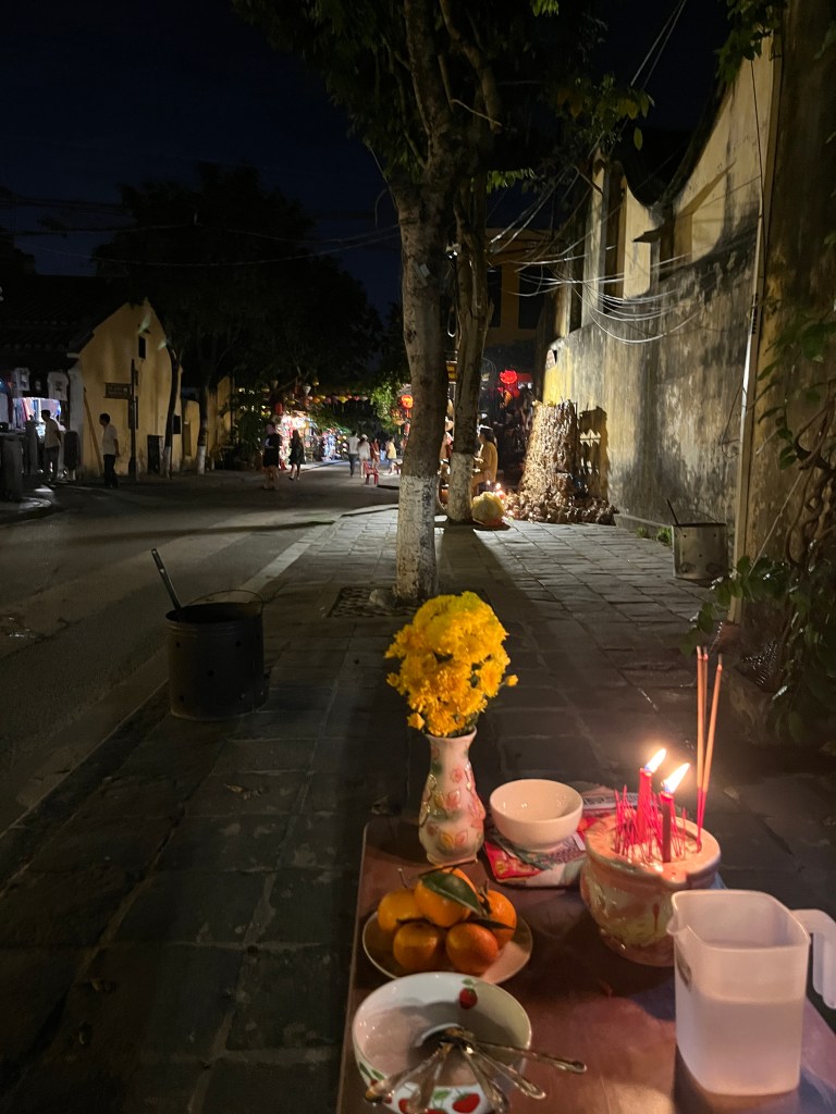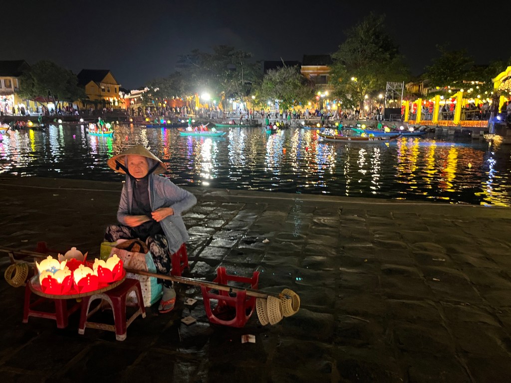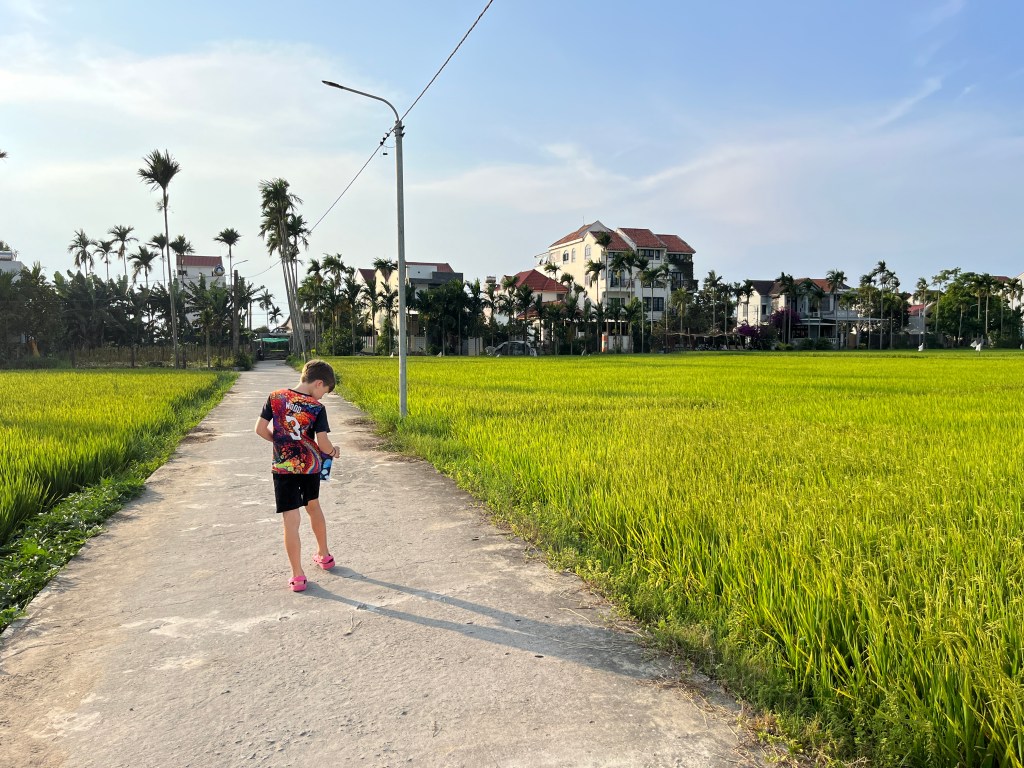 The Art of Coffee – Vietnamese Coffee Culture is not part of the late 20th century coffee craze. It’s its own thing, started in the 1850s with French colonial influence. Salt Coffee is my fav, but Egg Coffee was invented in Hanoi in the 1946 by a bartender looking for a milk substitute during a shortage. Now, it’s everywhere.Old Town’s lanterns are the epitome of Vietnam’s charm.Always suckers for glowing, flying things.Releasing a floating lantern is supposed to bring good luck. They use these little baskets on a stick to lower them into the river.Hanging in an OIt’s a dream-like atmosphere… if you can close your ears to the chaos. By BoatWe did worry about polluting the river, so we didn’t buy any lanterns, but we were handed a couple by our boatman.There has been a bit of an obsession developing around tattoos, so the boys each got a henna one.The eldest took a video-editing workshop from an Italian world-schooling teenager. It was great, and now he is making his own videos and exploring new features and concepts.15 Years MarriedA South African man, who now lives in the Granite Hills in Australia, has a wine bar with a nice variety of wines and a killer cheese platter. (I so miss cheese.) Seemed a good choice for a sneak-off anniversary happy hour.Waiting for a Grab ride. This “ride-hailing” app is such a game-changer for travellers. Much like Uber, you don’t have to have cash or physically find a driver. You don’t have to worry about change or negotiations or being over-charged. It’s made running around Hoi An so much easier as a parent. The driver usually arrives in about two minutes. So grateful for this development. (This photo was actually taken because I think my journey to being shortest member of the family is speeding up. I’ll be passed soon.)Just a house on our little lane, stylin’ their own funky style. I love it.This yellow is the colour of almost all the buildings in Old Town. They wear their patterns of age with such panache and truth, more beautiful for their ownership of these markings of Time.Thich Nhat Hanh, Buddhist monk and peace advocate, is from Vietnam. He wrote the book No Mud, No Lotus: The Art of Transforming Suffering. I think of this a lot.While I used to see my boys hunched over in the hypnosis of screens, now I see them hunched over in curiosity for life. Such a win. No words.It’s all a feast for the senses. This coffee is special. It’s Weasel Coffee, or Kopi Luwak. These weasels, Asian Palm Civets, eat the coffee fruit, and then poo them out, their digestive enzymes having dissolved the pulpy casings, leaving the bean intact. After being thoroughly cleaned (we hope), the coffee is supposed to have an extra smooth taste. The little one was not impress with this bowl of weasel poo. The older two took a survival course which involved shelter-making and fire-starting. Yes, we paid for this.They also had a raft-building competition. The boys were impressed with the kids who had sailed for a year and could tie knots without looking. Then they raced the rafts. The middle one’s won.There was an afternoon of water play, including paddle boarding and a ropes course that the little one joined in on. Maybe I should feel bad, but I take great joy in watching these hell-raisers strain and struggle and then plop in the water. Am I not supposed to share that? Reverence for Ho Chi Minh, The Great Leader. This month, on April 30th, the country will celebrate the 50-year anniversary of “Reunification” after Vietnam’s civil war. Interestingly, we will arrive in Hanoi on this day. The Vietnam Military History Museum there claims to offer “deep insight into Vietnam’s great victory against French colonialists and American imperialists.” I can’t wait to take the boys.Goldfish in a cafe table. I think this is Worldschooling in action. Not sure. (Neither is the boy.)I miss teaching English and defining the edges of usage and meaning. We had a good laugh about this message from our Hanoi AirB&B host. You cannot say one “must try” the airport transfer. And “2-way shipping” of laundry is just not quite right. I just love what is revealed by misusage. School at our place.The office this month. With a riverview!We’ve had our first illness. Poor Dad. Luckily (I think), the pharmacy gave him some antibiotics over the counter. Not a great practice in general, but hopefully an easy fix for us. (grimace) This decongestant may be helpful too?StreetfoodMagic Hour in photography is just after dawn and just before sunset, when the light is soft and golden. Hoi An, with its lanterns and market lights, must be one of the best places in the world to enjoy this.Of course, the one photo where all my people look great, I’ve got my eyes half-closed. Oh well. Memory captured.Talk about light-play.Ancestor worship altars are set up on the street and in homes and business (which are often one and the same). Offerings of flowers, food and drink are laid out. Incense and candles call deceased relatives to the table.This was our perch in Old Town to watch the world go by. We gave the boys small amounts of cash, and they had a blast bargaining at the night market. They kept running back, laughing out tales of their great bartering skills. A little game of balloon volleyball with local kids on the walk home from dinner.A popular Hoi An attraction is to take the coconut boats through the local “coconut forest.” The little one is resting his arm on one of the coconuts. Not the “coconut” you imagine. These plants make roofs, the classic Vietnamese hats, as well as many other products.We felt a bit guilty being paddled around by an elderly couple. They did give us a paddle to pitch in, eventually.Our guides, who spoke little English, were the parents of the owner of the restaurant that runs the boat tours and cooking classes. They were quite skilled in making various charming forms from the palms.Rockin’ the Palm FashionThis is the moment I 