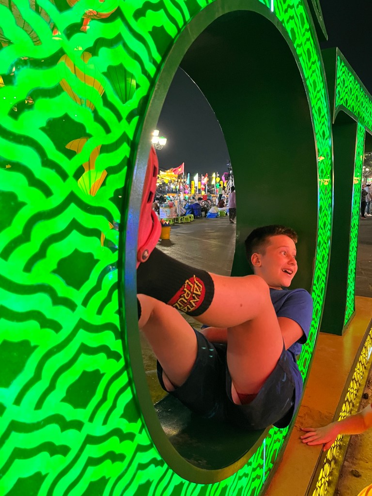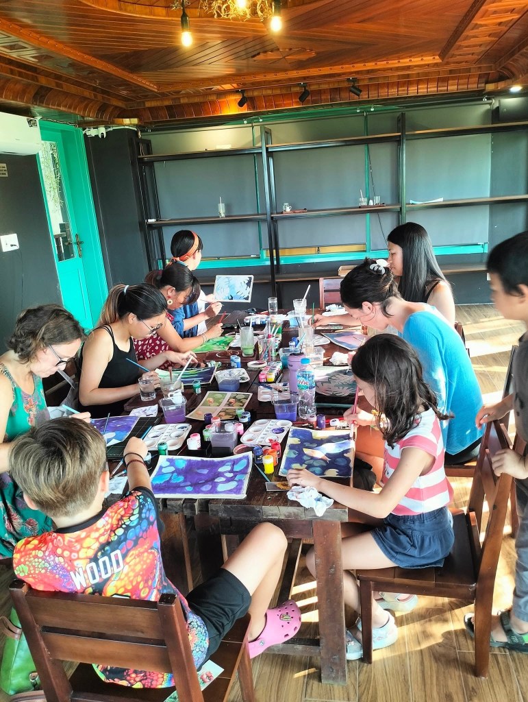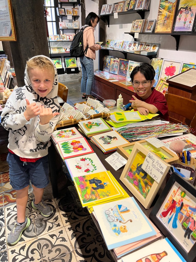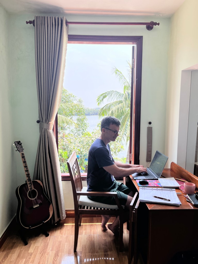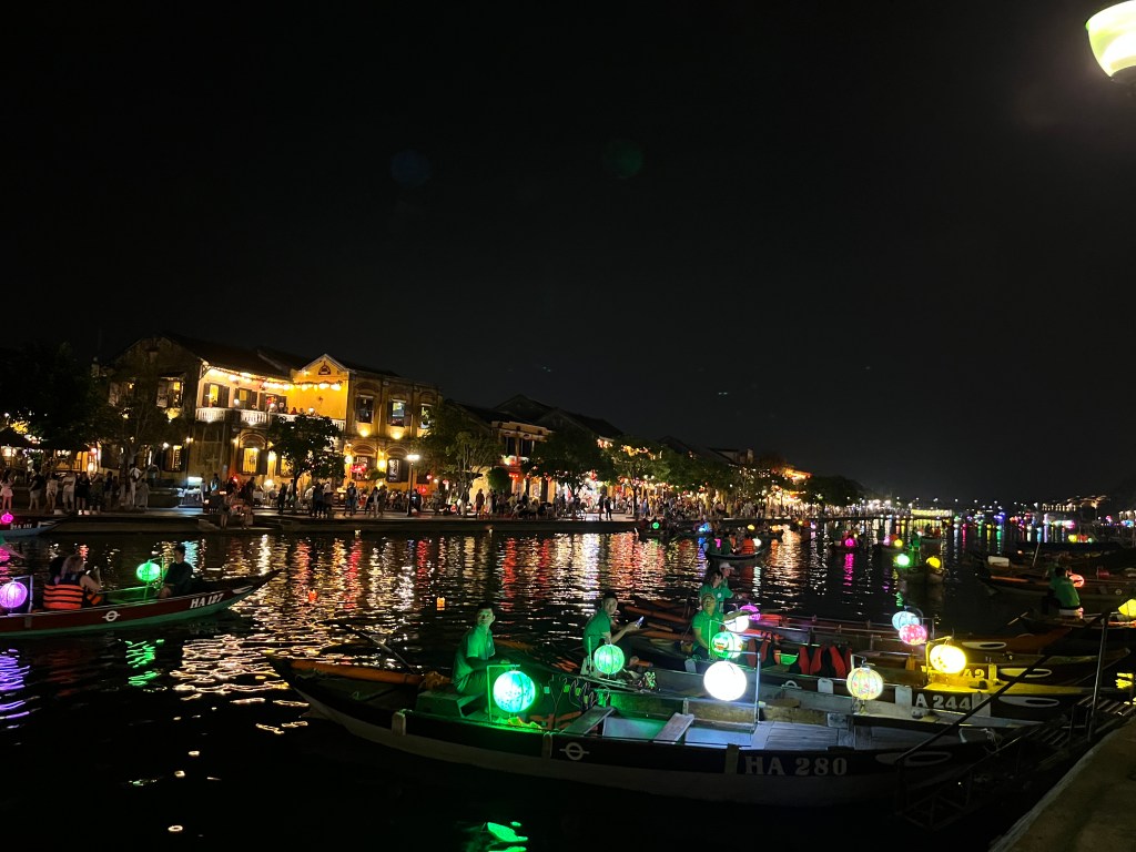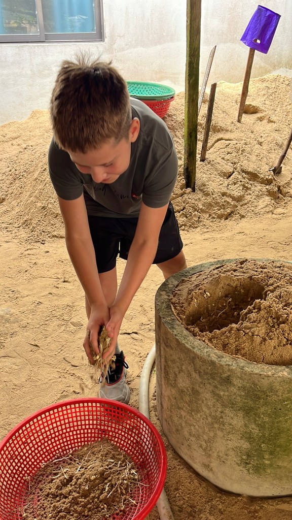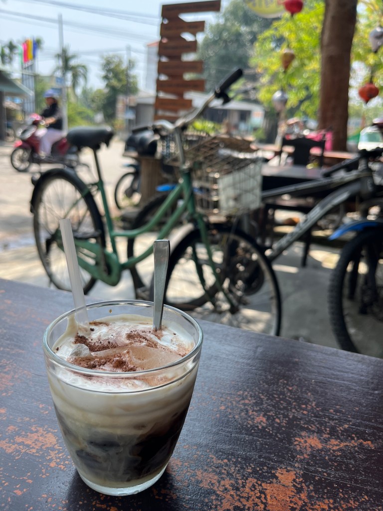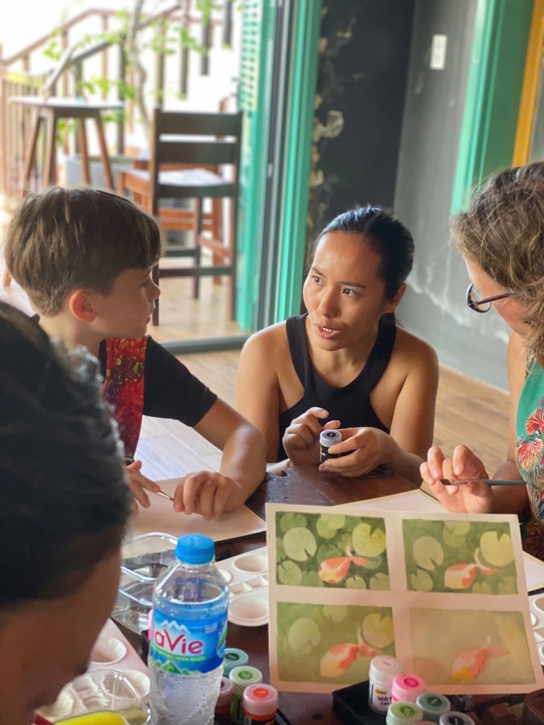 The Art of Coffee – Vietnamese Coffee Culture is not part of the late 20th century coffee craze. It’s its own thing, started in the 1850s with French colonial influence. Salt Coffee is my fav, but Egg Coffee was invented in Hanoi in the 1946 by a bartender looking for a milk substitute during a shortage. Now, it’s everywhere.Old Town’s lanterns are the epitome of Vietnam’s charm.Always suckers for glowing, flying things.Releasing a floating lantern is supposed to bring good luck. They use these little baskets on a stick to lower them into the river.Hanging in an OIt’s a dream-like atmosphere… if you can close your ears to the chaos. By BoatWe did worry about polluting the river, so we didn’t buy any lanterns, but we were handed a couple by our boatman.There has been a bit of an obsession developing around tattoos, so the boys each got a henna one.The eldest took a video-editing workshop from an Italian world-schooling teenager. It was great, and now he is making his own videos and exploring new features and concepts.15 Years MarriedA South African man, who now lives in the Granite Hills in Australia, has a wine bar with a nice variety of wines and a killer cheese platter. (I so miss cheese.) Seemed a good choice for a sneak-off anniversary happy hour.Waiting for a Grab ride. This “ride-hailing” app is such a game-changer for travellers. Much like Uber, you don’t have to have cash or physically find a driver. You don’t have to worry about change or negotiations or being over-charged. It’s made running around Hoi An so much easier as a parent. The driver usually arrives in about two minutes. So grateful for this development. (This photo was actually taken because I think my journey to being shortest member of the family is speeding up. I’ll be passed soon.)Just a house on our little lane, stylin’ their own funky style. I love it.This yellow is the colour of almost all the buildings in Old Town. They wear their patterns of age with such panache and truth, more beautiful for their ownership of these markings of Time.Thich Nhat Hanh, Buddhist monk and peace advocate, is from Vietnam. He wrote the book No Mud, No Lotus: The Art of Transforming Suffering. I think of this a lot.While I used to see my boys hunched over in the hypnosis of screens, now I see them hunched over in curiosity for life. Such a win. No words.It’s all a feast for the senses. This coffee is special. It’s Weasel Coffee, or Kopi Luwak. These weasels, Asian Palm Civets, eat the coffee fruit, and then poo them out, their digestive enzymes having dissolved the pulpy casings, leaving the bean intact. After being thoroughly cleaned (we hope), the coffee is supposed to have an extra smooth taste. The little one was not impress with this bowl of weasel poo. The older two took a survival course which involved shelter-making and fire-starting. Yes, we paid for this.They also had a raft-building competition. The boys were impressed with the kids who had sailed for a year and could tie knots without looking. Then they raced the rafts. The middle one’s won.There was an afternoon of water play, including paddle boarding and a ropes course that the little one joined in on. Maybe I should feel bad, but I take great joy in watching these hell-raisers strain and struggle and then plop in the water. Am I not supposed to share that? Reverence for Ho Chi Minh, The Great Leader. This month, on April 30th, the country will celebrate the 50-year anniversary of “Reunification” after Vietnam’s civil war. Interestingly, we will arrive in Hanoi on this day. The Vietnam Military History Museum there claims to offer “deep insight into Vietnam’s great victory against French colonialists and American imperialists.” I can’t wait to take the boys.Goldfish in a cafe table. I think this is Worldschooling in action. Not sure. (Neither is the boy.)I miss teaching English and defining the edges of usage and meaning. We had a good laugh about this message from our Hanoi AirB&B host. You cannot say one “must try” the airport transfer. And “2-way shipping” of laundry is just not quite right. I just love what is revealed by misusage. School at our place.The office this month. With a riverview!We’ve had our first illness. Poor Dad. Luckily (I think), the pharmacy gave him some antibiotics over the counter. Not a great practice in general, but hopefully an easy fix for us. (grimace) This decongestant may be helpful too?StreetfoodMagic Hour in photography is just after dawn and just before sunset, when the light is soft and golden. Hoi An, with its lanterns and market lights, must be one of the best places in the world to enjoy this.Of course, the one photo where all my people look great, I’ve got my eyes half-closed. Oh well. Memory captured.Talk about light-play.Ancestor worship altars are set up on the street and in homes and business (which are often one and the same). Offerings of flowers, food and drink are laid out. Incense and candles call deceased relatives to the table.This was our perch in Old Town to watch the world go by. We gave the boys small amounts of cash, and they had a blast bargaining at the night market. They kept running back, laughing out tales of their great bartering skills. A little game of balloon volleyball with local kids on the walk home from dinner.A popular Hoi An attraction is to take the coconut boats through the local “coconut forest.” The little one is resting his arm on one of the coconuts. Not the “coconut” you imagine. These plants make roofs, the classic Vietnamese hats, as well as many other products.We felt a bit guilty being paddled around by an elderly couple. They did give us a paddle to pitch in, eventually.Our guides, who spoke little English, were the parents of the owner of the restaurant that runs the boat tours and cooking classes. They were quite skilled in making various charming forms from the palms.Rockin’ the Palm FashionThis is the moment I 
