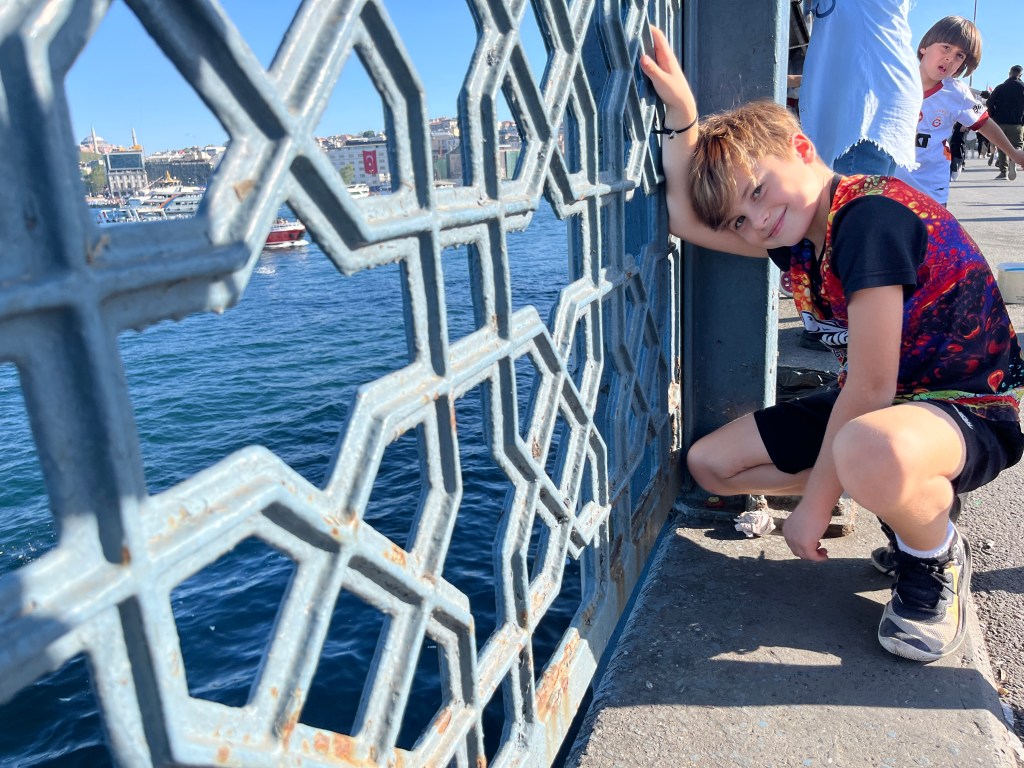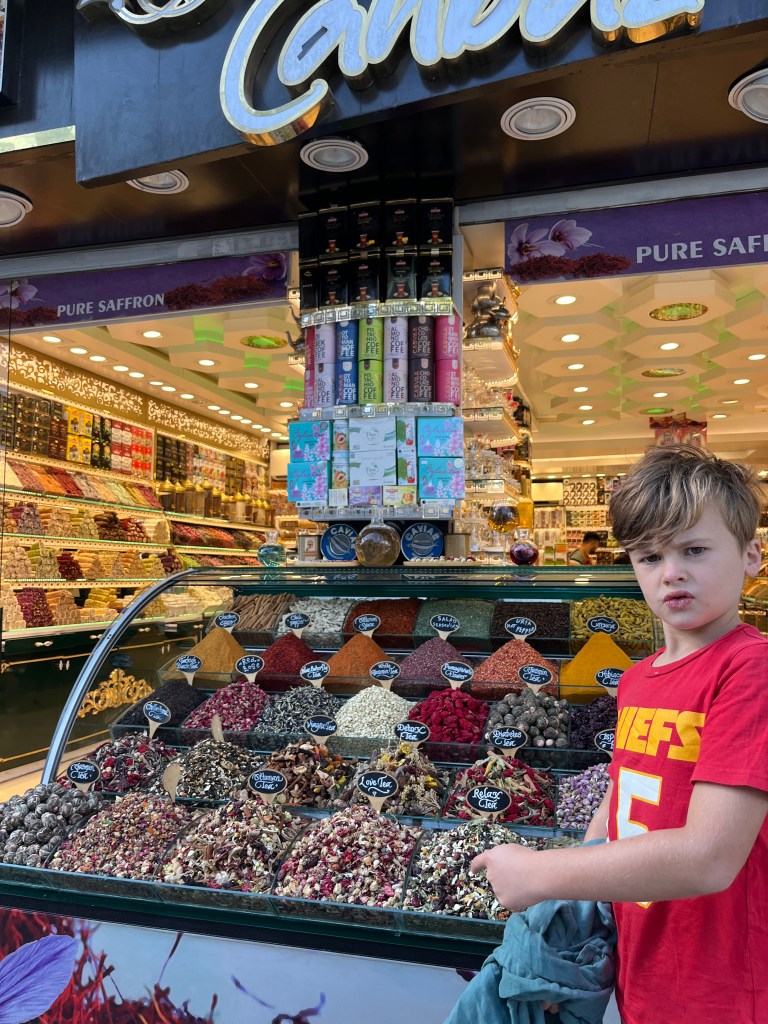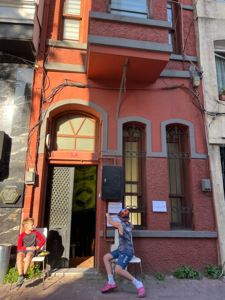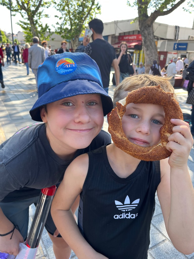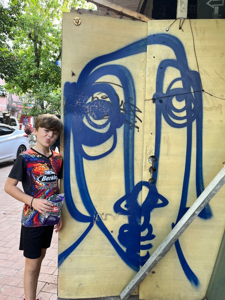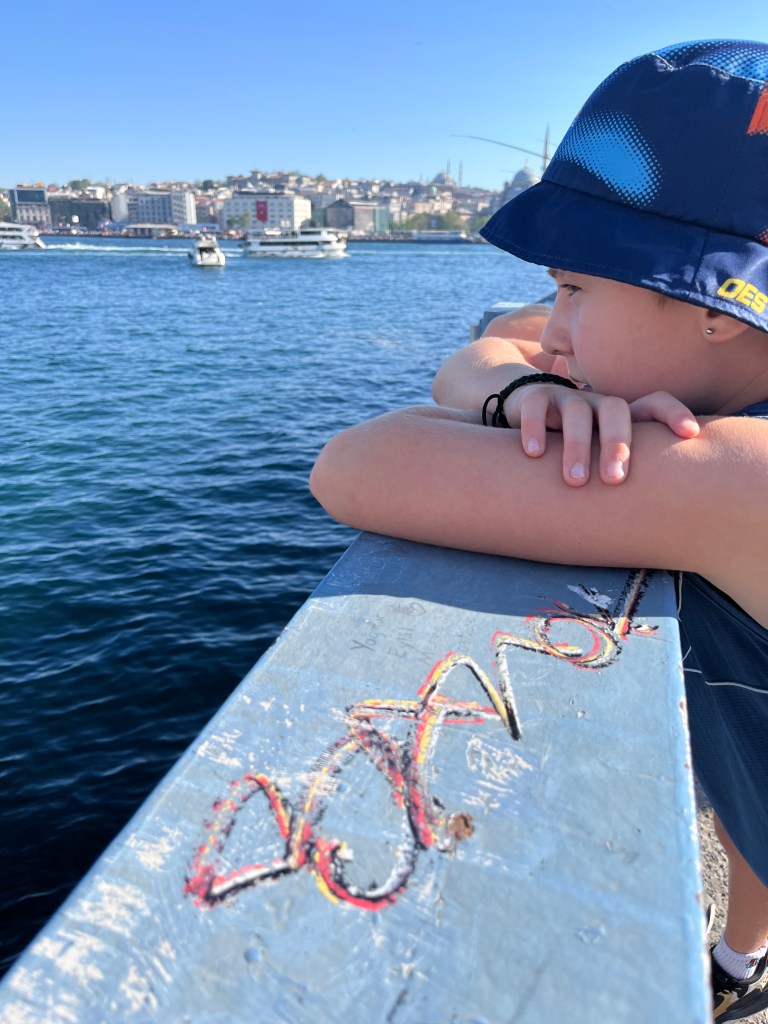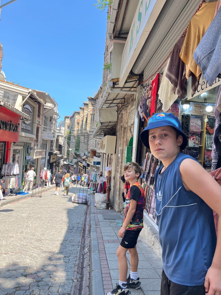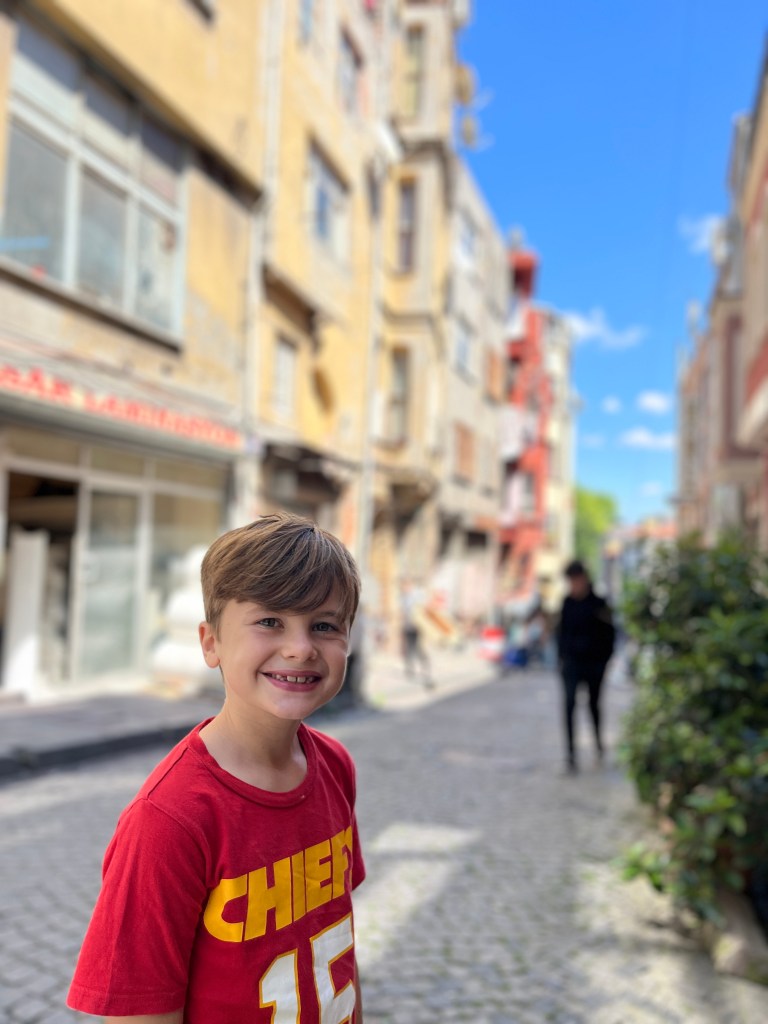 Our little connoisseur of cuisine in now getting into teas, and the Turks sure make them look appealing.We started our first day in Istanbul with a walking-tour. This is the German Fountain – a gift bringing water to the people. Of course, there were politics behind it. Friendly, but strategic ones, intended to increase approval of the German Emperor Kaiser Wilhelm II.This Egyptian Obelisk is the oldest artifact in Istanbul- older than the city itself. (WARNING: History detour ahead.) Emperor Theodosius moved the Obelisk, made in 1736 B.C. by the Pharoah Tutmosis, into the middle of the hippodrome (chariot stadium) in Constantinople near 390 BC. Even the iron braces are left from that era. The base tells a story too. The capital of the Roman Empire had been moved from Rome to what was then known as Byzantium (later Constantinople, then Istanbul) because the city was so well positioned. They called this “New Rome.” Later, when Emperor Theodosius I (centre) died, he gave the eastern and western halves of the Roman Empire to his sons (the children depicted left and right) because the Empire had gotten too large to be ruled by one emperor. After this division, the Roman Empire continued its decline, and Constantinople eventually became Byzantine in culture, which was Christian, Greco-Roman and Persian influenced. (I’m typing this out to get myself straight. I’ve never been great at retaining history. I do better when learning in person though.)Our guide was a cool, local guy.This is not the smile of a boy pumped to learn about a mosque. It’s the smile of a little kid flipping the bird in the famous and glorious Blue Mosque. Sometimes I manage a good framing. This is an ostrich egg hanging here in a golden brace because their scent is believed to ward off spiders and prevent cobwebs in the mosque.This is a big brother loose-tooth consult in the shadow of the Hagia Sofia.The Hagia Sofia we see today was built in 537 CE after many rebuilds and repairs from fires, riots, and earthquakes. In 1453, under the Ottoman Empire, the massive church became a mosque, and the four minarets were added by various emperors. It was turned into a museum in 1934 by secular president Kemal Ataturk, the first president of the modern Turkish Republic. However, in 2020, it was turned back into a muslim house of worship. Inside you can see the famous frescos in the balcony, but visitors are not allowed to enter at the ground level.The Grand Bazaar is filled with men in closet-like shops either looking bored or pumped up to pull off a sale. There are no fixed prices, so the traps are set, but the atmosphere is still jovial. It was more mall-like than I had expected. The word “bazaar” had me thinking market-like tents. It’s a beautiful display of Turkish craftsmanship in any case, and there’s a bustling, consumeristic electricity in the air. It’s a good place to walk in the rain too- 3,600 shops, 64 streets, and 22 entrances. If only I were into shopping…A meatball place recommended by our guide. Corn is for sale as a snack everywhere in the historic areas. The kids eat it up like crazy. It’s cheap and keeps the grumps at bay.Black, grey, white, cream, brown, and navy blue in some combo is the unspoken dress code of Istanbulites. You can spot a tourist by their deviation from the local fashion pallet.There are always kids in a park happy to welcome in new players.Stuff. How much stuff does there need to be in the world? And where are all the humans putting it? And why is it so damn alluring to children and adults alike? Istanbul is full of people displaying and moving stuff around. A post may be simmering on this…This was a common site in our neighbourhood- Fatih. There is a man on the other side of this dolly and a steep hill behind him. More stuff. I prefer the company of dogs, but cats are cool. Can’t deny it. They are the little divas of the animal kingdom. I got to take an early morning walk on my own to a Coffee Making and Fortune Telling class. AirB&B “Experiences” have proven to have some great offerings. (I didn’t notice the “no photography” sign hanging there until after I’d taken this.)We began our class with this tradition. Kolonya is offered when entering a Turkish home, along with a plate of candy. The cologne is rubbed into both sides of the hands and then inhaled to give a sense of refreshment. The candy is to ensure a sweet encounter between hosts and guests.After a lecture about Turkish coffee history, we watched a demo and then did the process ourselves. We hand-ground the beans with the golden-coloured grinder, then placed them in the cezve, the little pot with long handle. We added water, stirring no more than ten times. Then we placed it on the burner. You let it rise up twice. After the first rising, you remove the cezve from the heat and scoop off the bubbly foam and place it in your cup. This will be your fortune.The word for “brown” in Turkish basically means “coffee coloured.” According to the teacher, the various shades of brown follow this coffee comparison in ways such as “coffee with a bit of milk colour” or “double roasted coffee colour.” Socio-linguistics is so fun. We were also informed that if we order a Turkish coffee in a cafe, it should always come with at least one Turkish Delight (or similar sweet) and a glass of water. If not, we are well within our rights to question this gross negligence.After drinking the coffee liquid, you save the famous sludge and “close the cup” (place the saucer on top). Then you swirl it around, making circles, and ask a question or make a wish. Next, you upturn the cup and saucer together and let them sit for ten to twelve minutes. The teacher explained that coffee is really just an excuse for enjoying friendship, and the fortune telling is just a way to share one’s hopes and connect with someone who is valued. You can place an item of your possession on the cup as it sets in order to infu