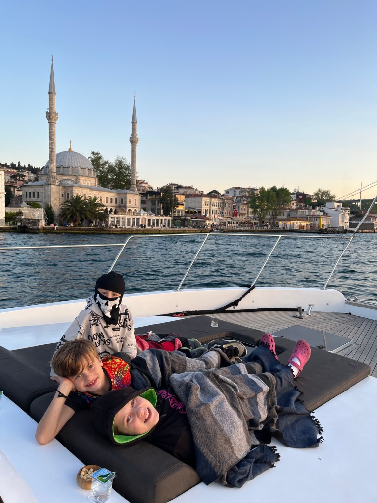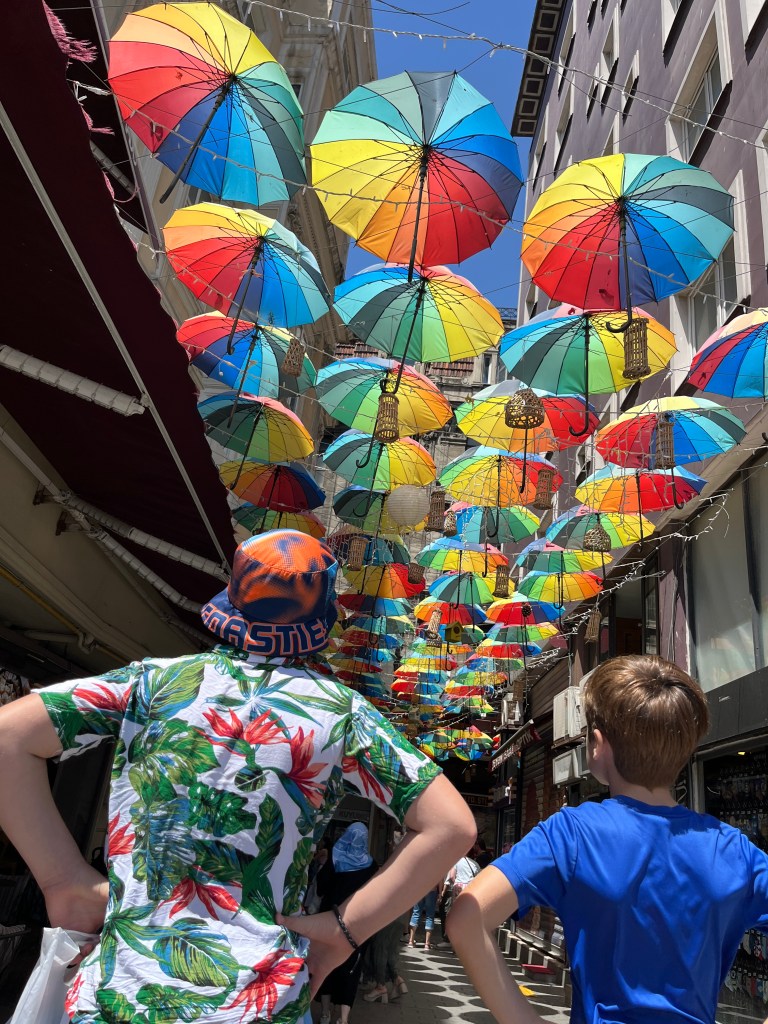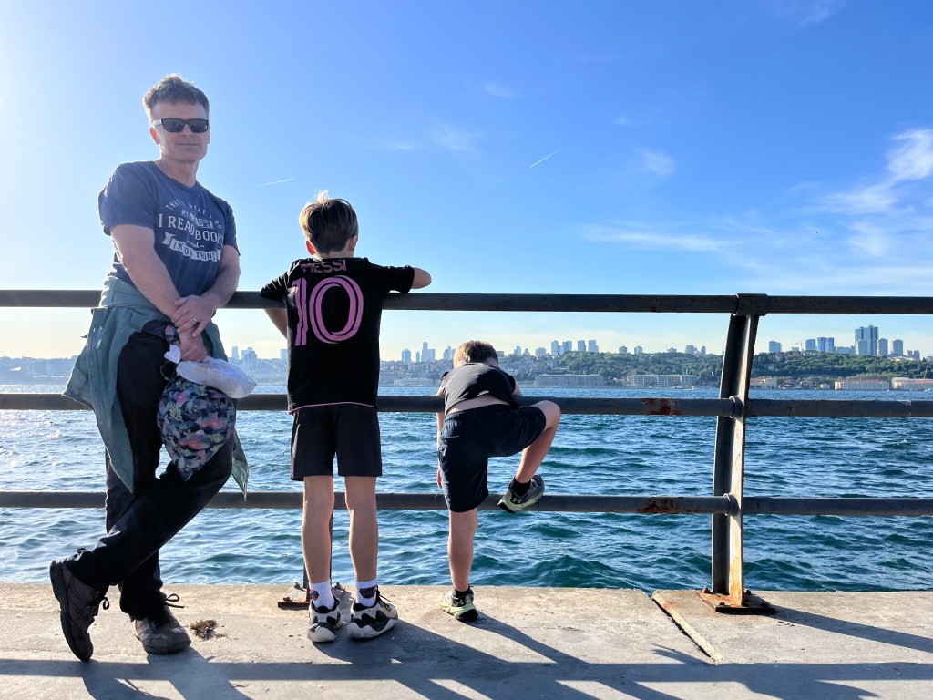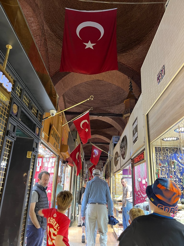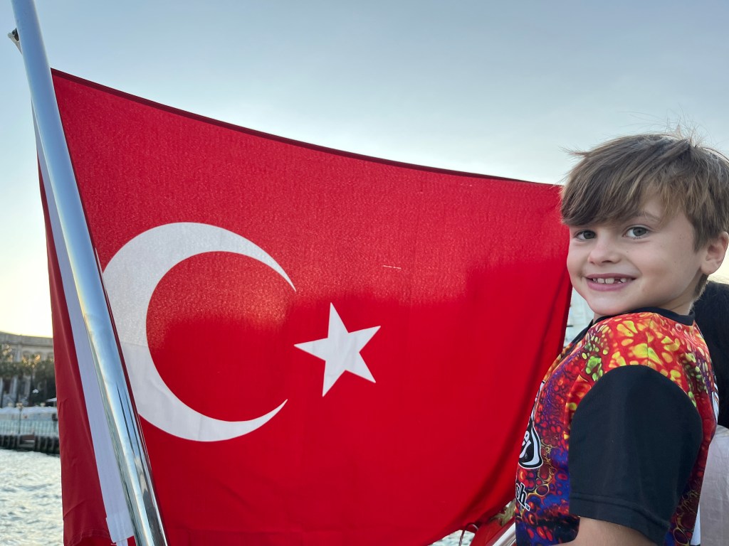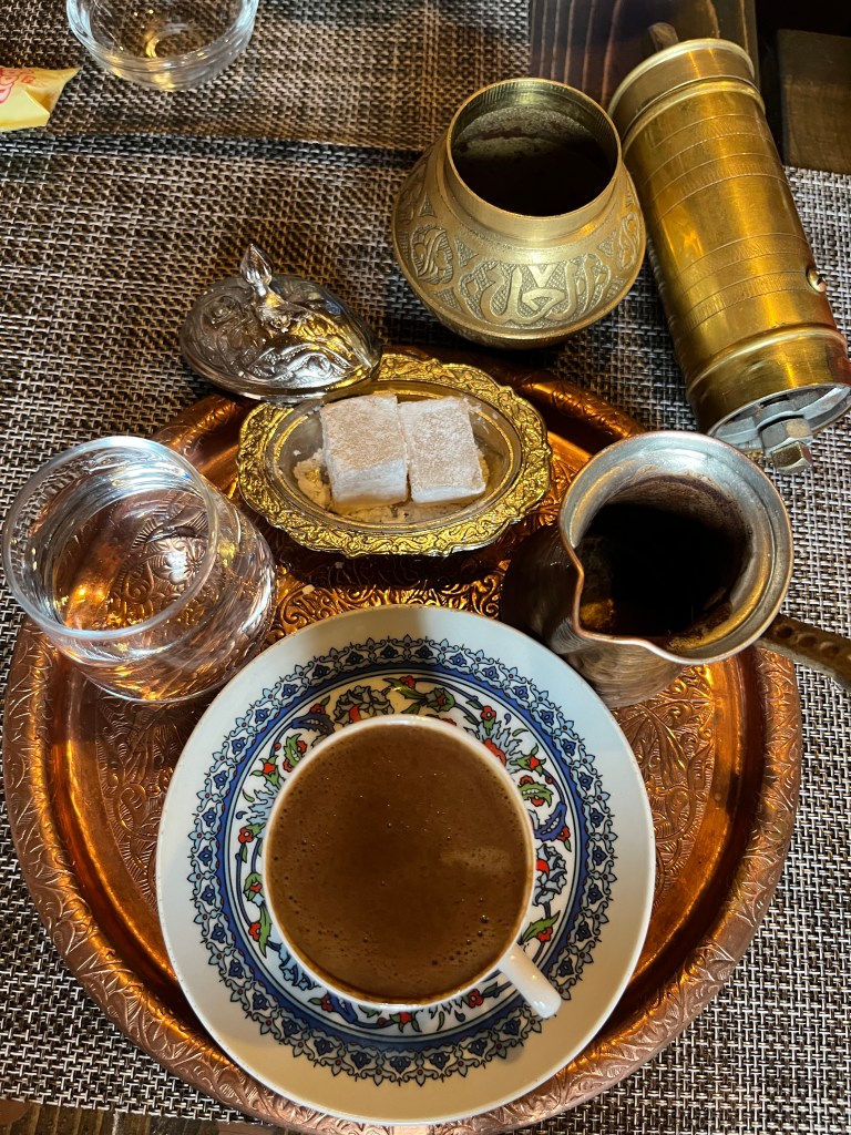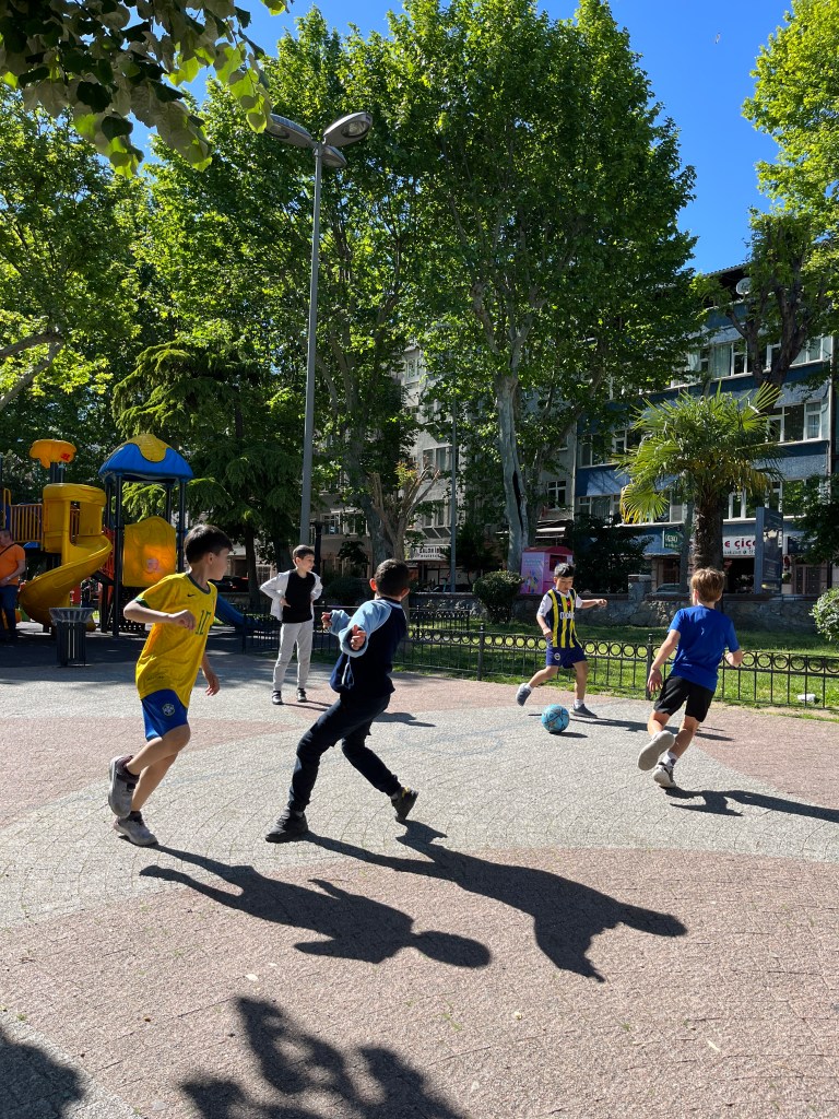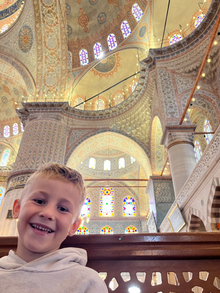 Our little connoisseur of cuisine in now getting into teas, and the Turks sure make them look appealing.We started our first day in Istanbul with a walking-tour. This is the German Fountain – a gift bringing water to the people. Of course, there were politics behind it. Friendly, but strategic ones, intended to increase approval of the German Emperor Kaiser Wilhelm II.This Egyptian Obelisk is the oldest artifact in Istanbul- older than the city itself. (WARNING: History detour ahead.) Emperor Theodosius moved the Obelisk, made in 1736 B.C. by the Pharoah Tutmosis, into the middle of the hippodrome (chariot stadium) in Constantinople near 390 BC. Even the iron braces are left from that era. The base tells a story too. The capital of the Roman Empire had been moved from Rome to what was then known as Byzantium (later Constantinople, then Istanbul) because the city was so well positioned. They called this “New Rome.” Later, when Emperor Theodosius I (centre) died, he gave the eastern and western halves of the Roman Empire to his sons (the children depicted left and right) because the Empire had gotten too large to be ruled by one emperor. After this division, the Roman Empire continued its decline, and Constantinople eventually became Byzantine in culture, which was Christian, Greco-Roman and Persian influenced. (I’m typing this out to get myself straight. I’ve never been great at retaining history. I do better when learning in person though.)Our guide was a cool, local guy.This is not the smile of a boy pumped to learn about a mosque. It’s the smile of a little kid flipping the bird in the famous and glorious Blue Mosque. Sometimes I manage a good framing. This is an ostrich egg hanging here in a golden brace because their scent is believed to ward off spiders and prevent cobwebs in the mosque.This is a big brother loose-tooth consult in the shadow of the Hagia Sofia.The Hagia Sofia we see today was built in 537 CE after many rebuilds and repairs from fires, riots, and earthquakes. In 1453, under the Ottoman Empire, the massive church became a mosque, and the four minarets were added by various emperors. It was turned into a museum in 1934 by secular president Kemal Ataturk, the first president of the modern Turkish Republic. However, in 2020, it was turned back into a muslim house of worship. Inside you can see the famous frescos in the balcony, but visitors are not allowed to enter at the ground level.The Grand Bazaar is filled with men in closet-like shops either looking bored or pumped up to pull off a sale. There are no fixed prices, so the traps are set, but the atmosphere is still jovial. It was more mall-like than I had expected. The word “bazaar” had me thinking market-like tents. It’s a beautiful display of Turkish craftsmanship in any case, and there’s a bustling, consumeristic electricity in the air. It’s a good place to walk in the rain too- 3,600 shops, 64 streets, and 22 entrances. If only I were into shopping…A meatball place recommended by our guide. Corn is for sale as a snack everywhere in the historic areas. The kids eat it up like crazy. It’s cheap and keeps the grumps at bay.Black, grey, white, cream, brown, and navy blue in some combo is the unspoken dress code of Istanbulites. You can spot a tourist by their deviation from the local fashion pallet.There are always kids in a park happy to welcome in new players.Stuff. How much stuff does there need to be in the world? And where are all the humans putting it? And why is it so damn alluring to children and adults alike? Istanbul is full of people displaying and moving stuff around. A post may be simmering on this…This was a common site in our neighbourhood- Fatih. There is a man on the other side of this dolly and a steep hill behind him. More stuff. I prefer the company of dogs, but cats are cool. Can’t deny it. They are the little divas of the animal kingdom. I got to take an early morning walk on my own to a Coffee Making and Fortune Telling class. AirB&B “Experiences” have proven to have some great offerings. (I didn’t notice the “no photography” sign hanging there until after I’d taken this.)We began our class with this tradition. Kolonya is offered when entering a Turkish home, along with a plate of candy. The cologne is rubbed into both sides of the hands and then inhaled to give a sense of refreshment. The candy is to ensure a sweet encounter between hosts and guests.After a lecture about Turkish coffee history, we watched a demo and then did the process ourselves. We hand-ground the beans with the golden-coloured grinder, then placed them in the cezve, the little pot with long handle. We added water, stirring no more than ten times. Then we placed it on the burner. You let it rise up twice. After the first rising, you remove the cezve from the heat and scoop off the bubbly foam and place it in your cup. This will be your fortune.The word for “brown” in Turkish basically means “coffee coloured.” According to the teacher, the various shades of brown follow this coffee comparison in ways such as “coffee with a bit of milk colour” or “double roasted coffee colour.” Socio-linguistics is so fun. We were also informed that if we order a Turkish coffee in a cafe, it should always come with at least one Turkish Delight (or similar sweet) and a glass of water. If not, we are well within our rights to question this gross negligence.After drinking the coffee liquid, you save the famous sludge and “close the cup” (place the saucer on top). Then you swirl it around, making circles, and ask a question or make a wish. Next, you upturn the cup and saucer together and let them sit for ten to twelve minutes. The teacher explained that coffee is really just an excuse for enjoying friendship, and the fortune telling is just a way to share one’s hopes and connect with someone who is valued. You can place an item of your possession on the cup as it sets in order to infu