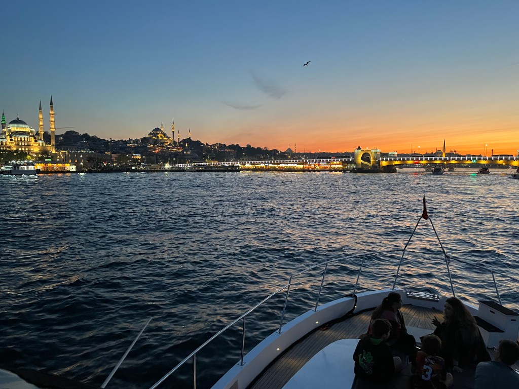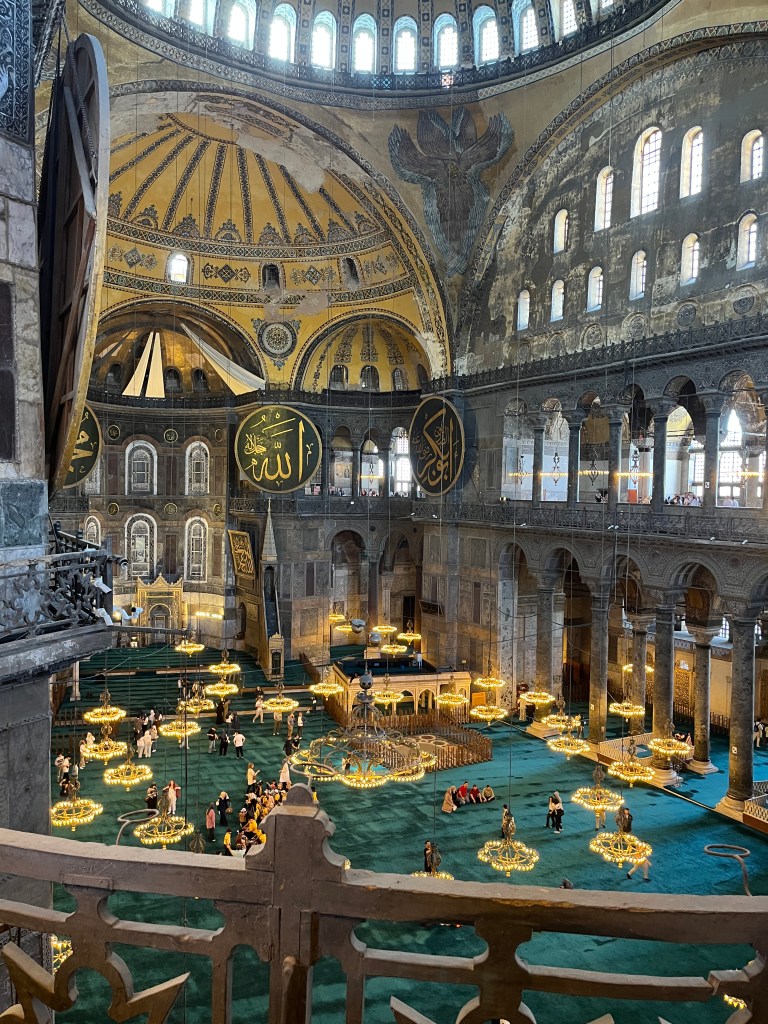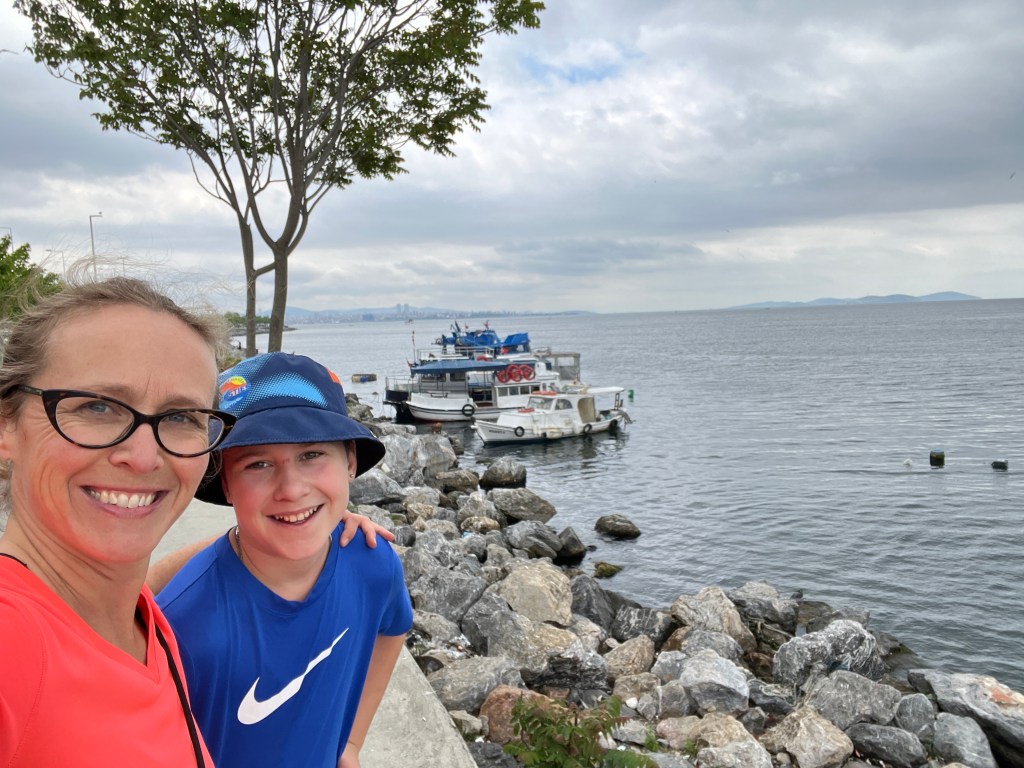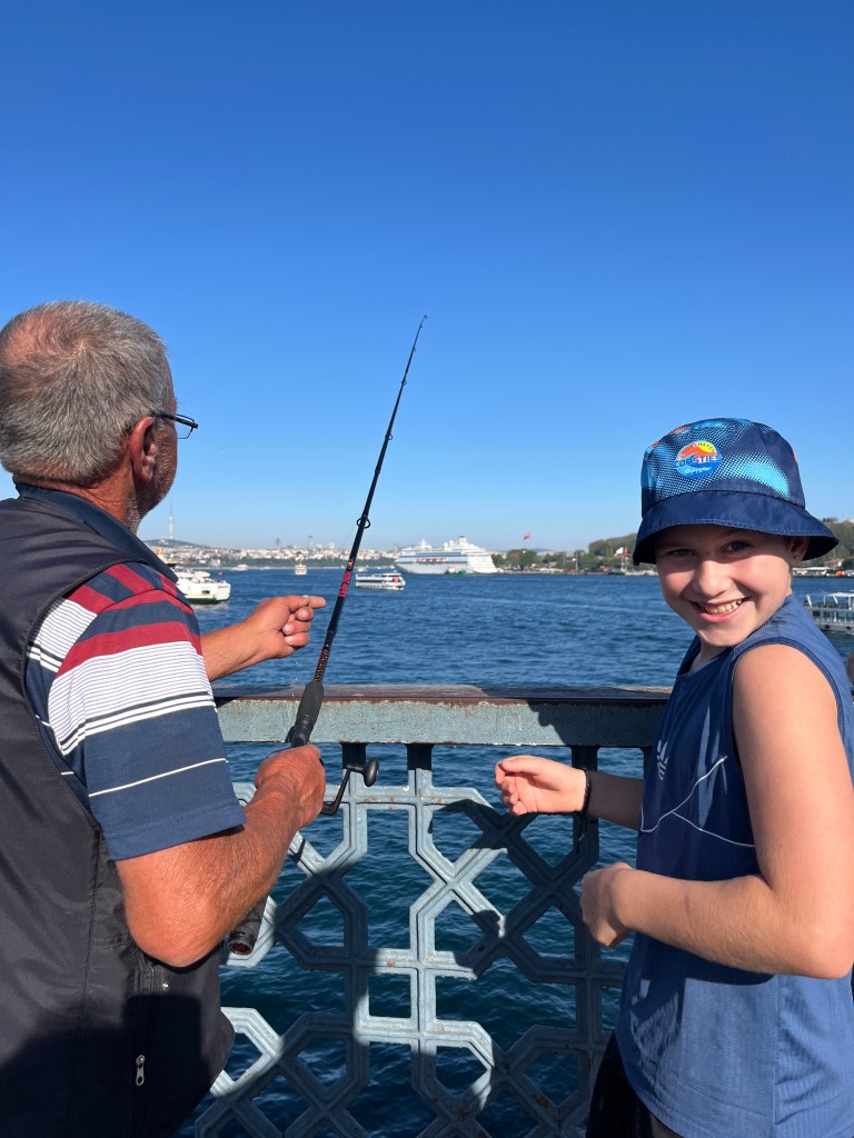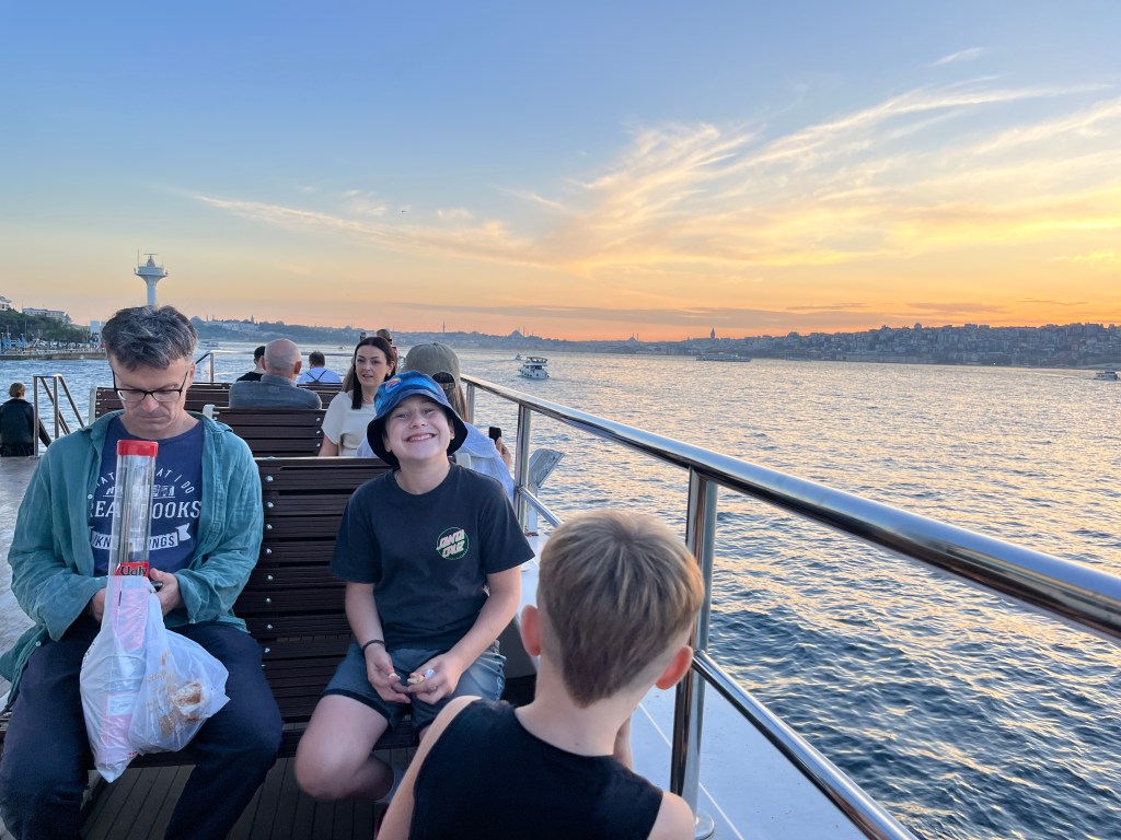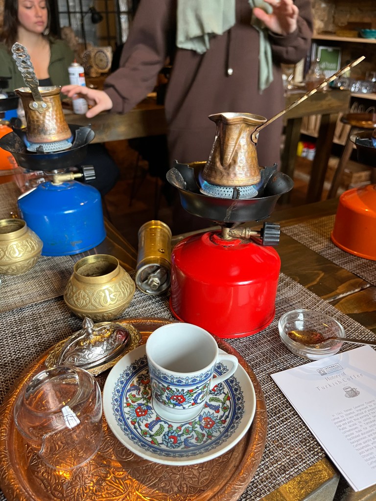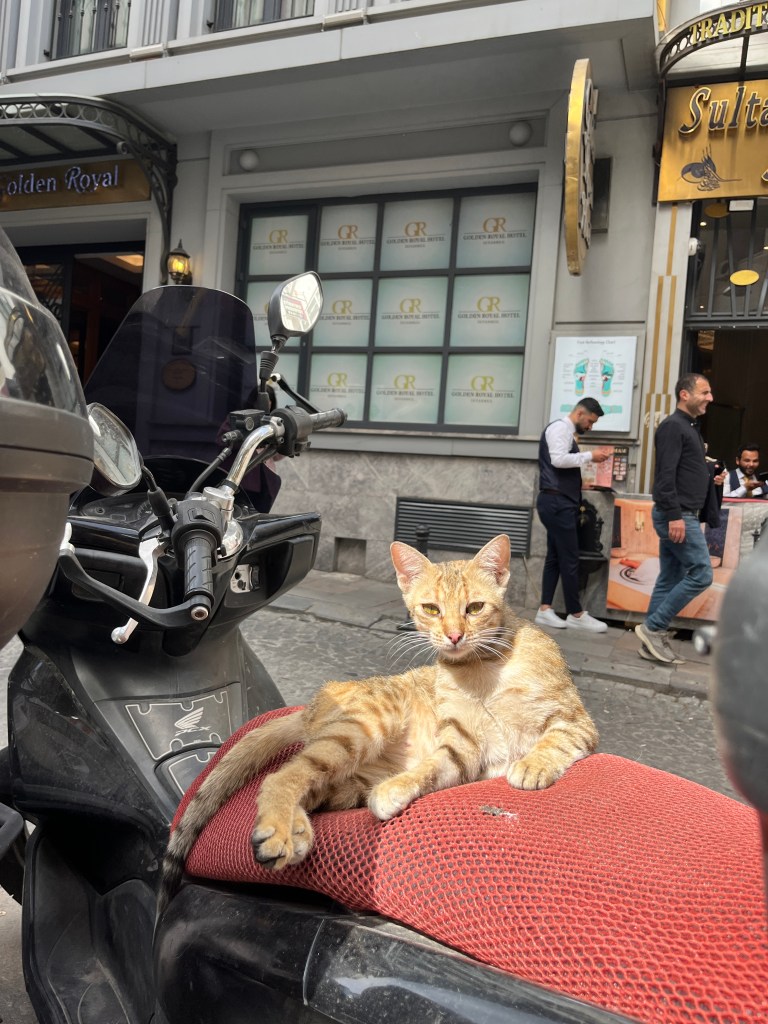 Our little connoisseur of cuisine in now getting into teas, and the Turks sure make them look appealing.We started our first day in Istanbul with a walking-tour. This is the German Fountain – a gift bringing water to the people. Of course, there were politics behind it. Friendly, but strategic ones, intended to increase approval of the German Emperor Kaiser Wilhelm II.This Egyptian Obelisk is the oldest artifact in Istanbul- older than the city itself. (WARNING: History detour ahead.) Emperor Theodosius moved the Obelisk, made in 1736 B.C. by the Pharoah Tutmosis, into the middle of the hippodrome (chariot stadium) in Constantinople near 390 BC. Even the iron braces are left from that era. The base tells a story too. The capital of the Roman Empire had been moved from Rome to what was then known as Byzantium (later Constantinople, then Istanbul) because the city was so well positioned. They called this “New Rome.” Later, when Emperor Theodosius I (centre) died, he gave the eastern and western halves of the Roman Empire to his sons (the children depicted left and right) because the Empire had gotten too large to be ruled by one emperor. After this division, the Roman Empire continued its decline, and Constantinople eventually became Byzantine in culture, which was Christian, Greco-Roman and Persian influenced. (I’m typing this out to get myself straight. I’ve never been great at retaining history. I do better when learning in person though.)Our guide was a cool, local guy.This is not the smile of a boy pumped to learn about a mosque. It’s the smile of a little kid flipping the bird in the famous and glorious Blue Mosque. Sometimes I manage a good framing. This is an ostrich egg hanging here in a golden brace because their scent is believed to ward off spiders and prevent cobwebs in the mosque.This is a big brother loose-tooth consult in the shadow of the Hagia Sofia.The Hagia Sofia we see today was built in 537 CE after many rebuilds and repairs from fires, riots, and earthquakes. In 1453, under the Ottoman Empire, the massive church became a mosque, and the four minarets were added by various emperors. It was turned into a museum in 1934 by secular president Kemal Ataturk, the first president of the modern Turkish Republic. However, in 2020, it was turned back into a muslim house of worship. Inside you can see the famous frescos in the balcony, but visitors are not allowed to enter at the ground level.The Grand Bazaar is filled with men in closet-like shops either looking bored or pumped up to pull off a sale. There are no fixed prices, so the traps are set, but the atmosphere is still jovial. It was more mall-like than I had expected. The word “bazaar” had me thinking market-like tents. It’s a beautiful display of Turkish craftsmanship in any case, and there’s a bustling, consumeristic electricity in the air. It’s a good place to walk in the rain too- 3,600 shops, 64 streets, and 22 entrances. If only I were into shopping…A meatball place recommended by our guide. Corn is for sale as a snack everywhere in the historic areas. The kids eat it up like crazy. It’s cheap and keeps the grumps at bay.Black, grey, white, cream, brown, and navy blue in some combo is the unspoken dress code of Istanbulites. You can spot a tourist by their deviation from the local fashion pallet.There are always kids in a park happy to welcome in new players.Stuff. How much stuff does there need to be in the world? And where are all the humans putting it? And why is it so damn alluring to children and adults alike? Istanbul is full of people displaying and moving stuff around. A post may be simmering on this…This was a common site in our neighbourhood- Fatih. There is a man on the other side of this dolly and a steep hill behind him. More stuff. I prefer the company of dogs, but cats are cool. Can’t deny it. They are the little divas of the animal kingdom. I got to take an early morning walk on my own to a Coffee Making and Fortune Telling class. AirB&B “Experiences” have proven to have some great offerings. (I didn’t notice the “no photography” sign hanging there until after I’d taken this.)We began our class with this tradition. Kolonya is offered when entering a Turkish home, along with a plate of candy. The cologne is rubbed into both sides of the hands and then inhaled to give a sense of refreshment. The candy is to ensure a sweet encounter between hosts and guests.After a lecture about Turkish coffee history, we watched a demo and then did the process ourselves. We hand-ground the beans with the golden-coloured grinder, then placed them in the cezve, the little pot with long handle. We added water, stirring no more than ten times. Then we placed it on the burner. You let it rise up twice. After the first rising, you remove the cezve from the heat and scoop off the bubbly foam and place it in your cup. This will be your fortune.The word for “brown” in Turkish basically means “coffee coloured.” According to the teacher, the various shades of brown follow this coffee comparison in ways such as “coffee with a bit of milk colour” or “double roasted coffee colour.” Socio-linguistics is so fun. We were also informed that if we order a Turkish coffee in a cafe, it should always come with at least one Turkish Delight (or similar sweet) and a glass of water. If not, we are well within our rights to question this gross negligence.After drinking the coffee liquid, you save the famous sludge and “close the cup” (place the saucer on top). Then you swirl it around, making circles, and ask a question or make a wish. Next, you upturn the cup and saucer together and let them sit for ten to twelve minutes. The teacher explained that coffee is really just an excuse for enjoying friendship, and the fortune telling is just a way to share one’s hopes and connect with someone who is valued. You can place an item of your possession on the cup as it sets in order to infu