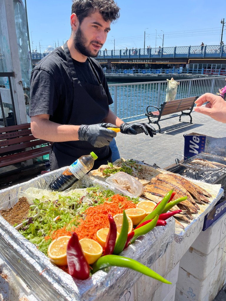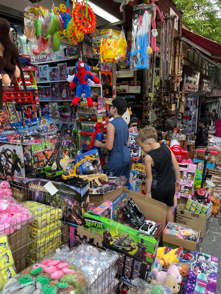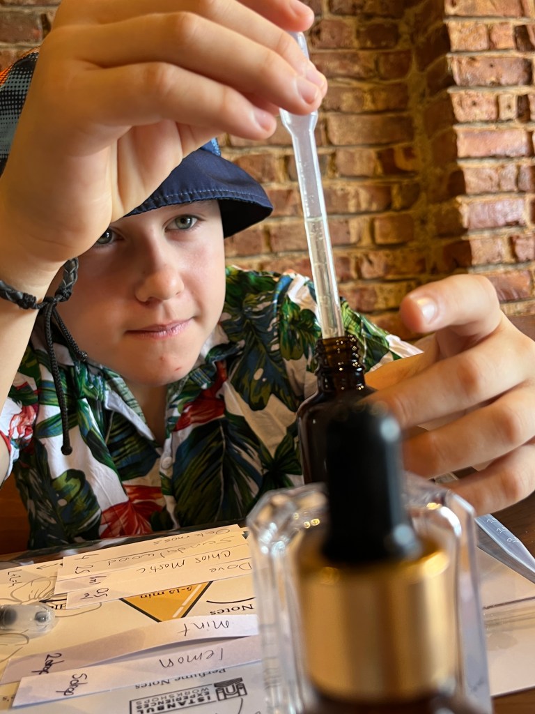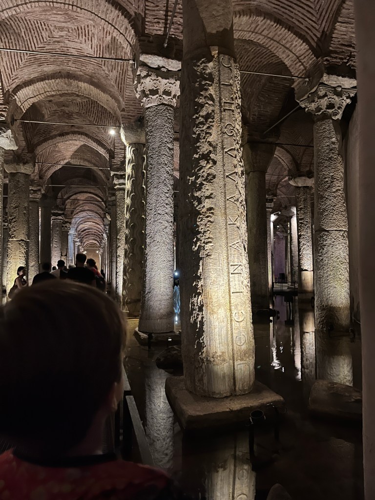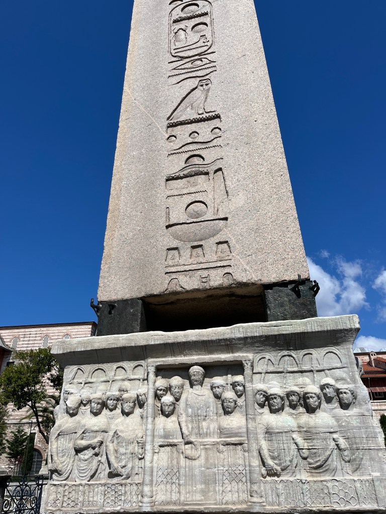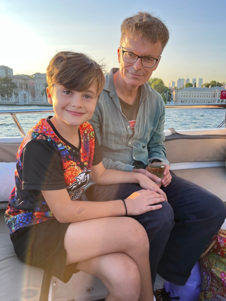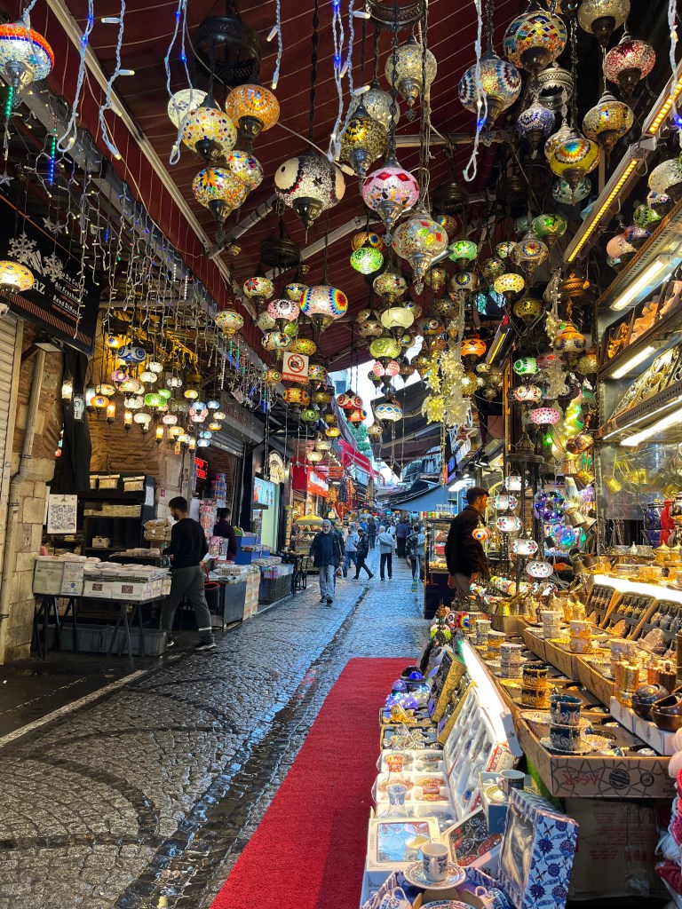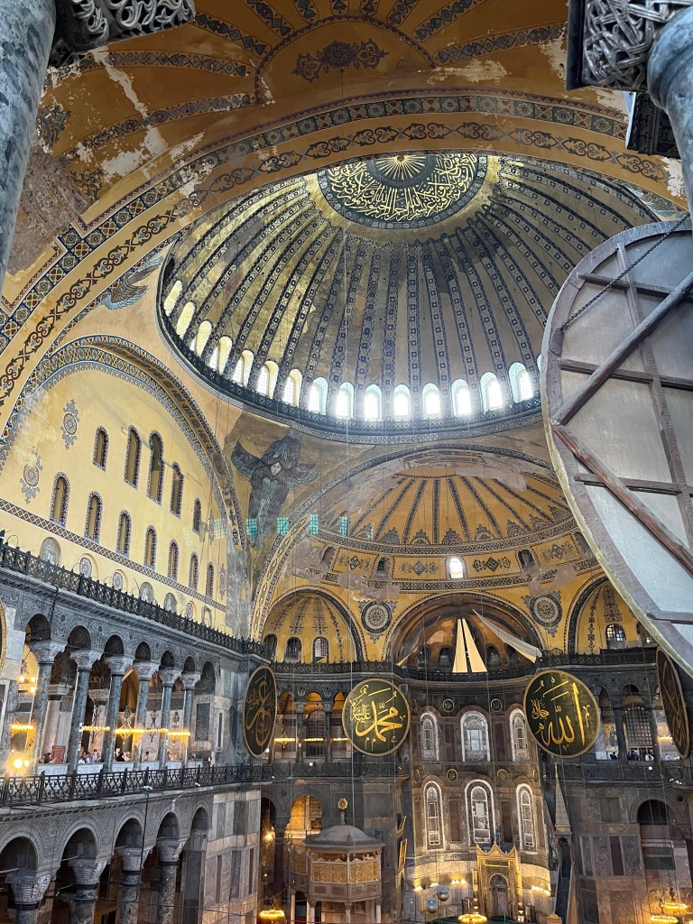 Our little connoisseur of cuisine in now getting into teas, and the Turks sure make them look appealing.We started our first day in Istanbul with a walking-tour. This is the German Fountain – a gift bringing water to the people. Of course, there were politics behind it. Friendly, but strategic ones, intended to increase approval of the German Emperor Kaiser Wilhelm II.This Egyptian Obelisk is the oldest artifact in Istanbul- older than the city itself. (WARNING: History detour ahead.) Emperor Theodosius moved the Obelisk, made in 1736 B.C. by the Pharoah Tutmosis, into the middle of the hippodrome (chariot stadium) in Constantinople near 390 BC. Even the iron braces are left from that era. The base tells a story too. The capital of the Roman Empire had been moved from Rome to what was then known as Byzantium (later Constantinople, then Istanbul) because the city was so well positioned. They called this “New Rome.” Later, when Emperor Theodosius I (centre) died, he gave the eastern and western halves of the Roman Empire to his sons (the children depicted left and right) because the Empire had gotten too large to be ruled by one emperor. After this division, the Roman Empire continued its decline, and Constantinople eventually became Byzantine in culture, which was Christian, Greco-Roman and Persian influenced. (I’m typing this out to get myself straight. I’ve never been great at retaining history. I do better when learning in person though.)Our guide was a cool, local guy.This is not the smile of a boy pumped to learn about a mosque. It’s the smile of a little kid flipping the bird in the famous and glorious Blue Mosque. Sometimes I manage a good framing. This is an ostrich egg hanging here in a golden brace because their scent is believed to ward off spiders and prevent cobwebs in the mosque.This is a big brother loose-tooth consult in the shadow of the Hagia Sofia.The Hagia Sofia we see today was built in 537 CE after many rebuilds and repairs from fires, riots, and earthquakes. In 1453, under the Ottoman Empire, the massive church became a mosque, and the four minarets were added by various emperors. It was turned into a museum in 1934 by secular president Kemal Ataturk, the first president of the modern Turkish Republic. However, in 2020, it was turned back into a muslim house of worship. Inside you can see the famous frescos in the balcony, but visitors are not allowed to enter at the ground level.The Grand Bazaar is filled with men in closet-like shops either looking bored or pumped up to pull off a sale. There are no fixed prices, so the traps are set, but the atmosphere is still jovial. It was more mall-like than I had expected. The word “bazaar” had me thinking market-like tents. It’s a beautiful display of Turkish craftsmanship in any case, and there’s a bustling, consumeristic electricity in the air. It’s a good place to walk in the rain too- 3,600 shops, 64 streets, and 22 entrances. If only I were into shopping…A meatball place recommended by our guide. Corn is for sale as a snack everywhere in the historic areas. The kids eat it up like crazy. It’s cheap and keeps the grumps at bay.Black, grey, white, cream, brown, and navy blue in some combo is the unspoken dress code of Istanbulites. You can spot a tourist by their deviation from the local fashion pallet.There are always kids in a park happy to welcome in new players.Stuff. How much stuff does there need to be in the world? And where are all the humans putting it? And why is it so damn alluring to children and adults alike? Istanbul is full of people displaying and moving stuff around. A post may be simmering on this…This was a common site in our neighbourhood- Fatih. There is a man on the other side of this dolly and a steep hill behind him. More stuff. I prefer the company of dogs, but cats are cool. Can’t deny it. They are the little divas of the animal kingdom. I got to take an early morning walk on my own to a Coffee Making and Fortune Telling class. AirB&B “Experiences” have proven to have some great offerings. (I didn’t notice the “no photography” sign hanging there until after I’d taken this.)We began our class with this tradition. Kolonya is offered when entering a Turkish home, along with a plate of candy. The cologne is rubbed into both sides of the hands and then inhaled to give a sense of refreshment. The candy is to ensure a sweet encounter between hosts and guests.After a lecture about Turkish coffee history, we watched a demo and then did the process ourselves. We hand-ground the beans with the golden-coloured grinder, then placed them in the cezve, the little pot with long handle. We added water, stirring no more than ten times. Then we placed it on the burner. You let it rise up twice. After the first rising, you remove the cezve from the heat and scoop off the bubbly foam and place it in your cup. This will be your fortune.The word for “brown” in Turkish basically means “coffee coloured.” According to the teacher, the various shades of brown follow this coffee comparison in ways such as “coffee with a bit of milk colour” or “double roasted coffee colour.” Socio-linguistics is so fun. We were also informed that if we order a Turkish coffee in a cafe, it should always come with at least one Turkish Delight (or similar sweet) and a glass of water. If not, we are well within our rights to question this gross negligence.After drinking the coffee liquid, you save the famous sludge and “close the cup” (place the saucer on top). Then you swirl it around, making circles, and ask a question or make a wish. Next, you upturn the cup and saucer together and let them sit for ten to twelve minutes. The teacher explained that coffee is really just an excuse for enjoying friendship, and the fortune telling is just a way to share one’s hopes and connect with someone who is valued. You can place an item of your possession on the cup as it sets in order to infu