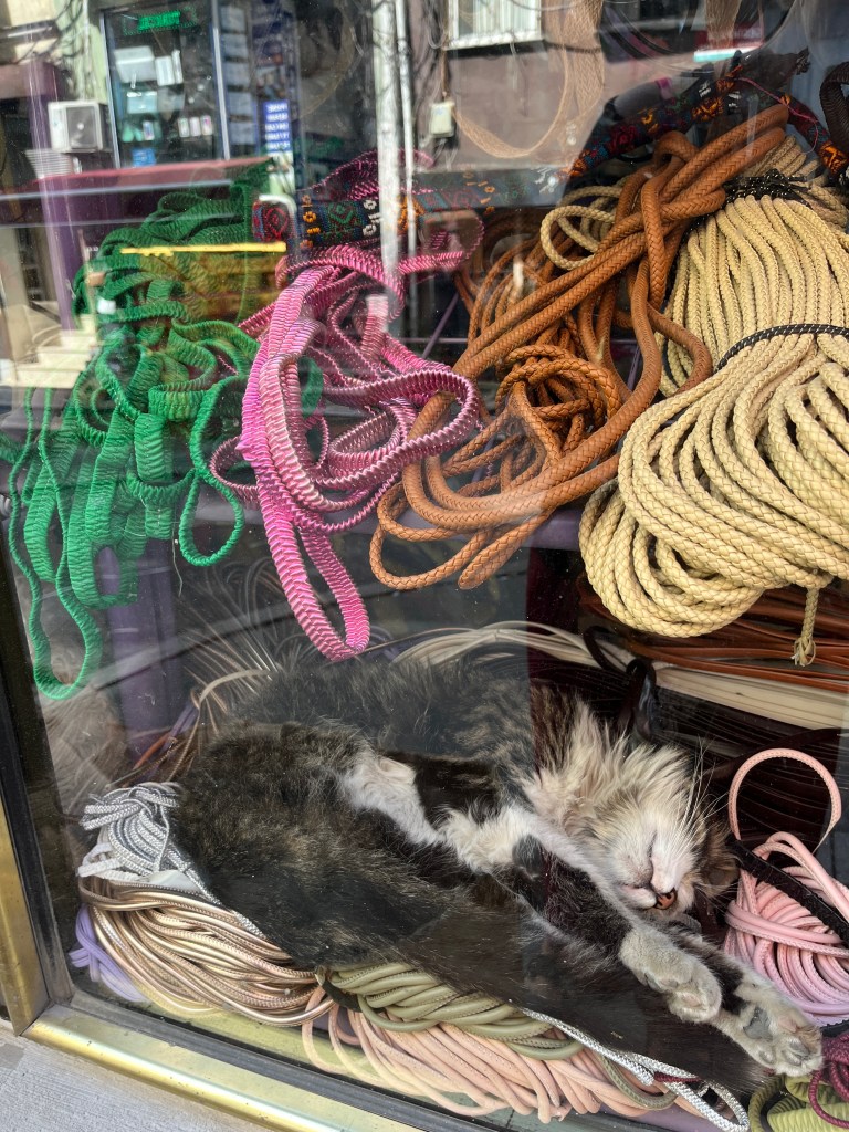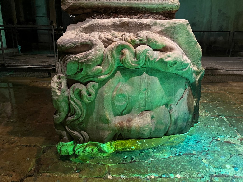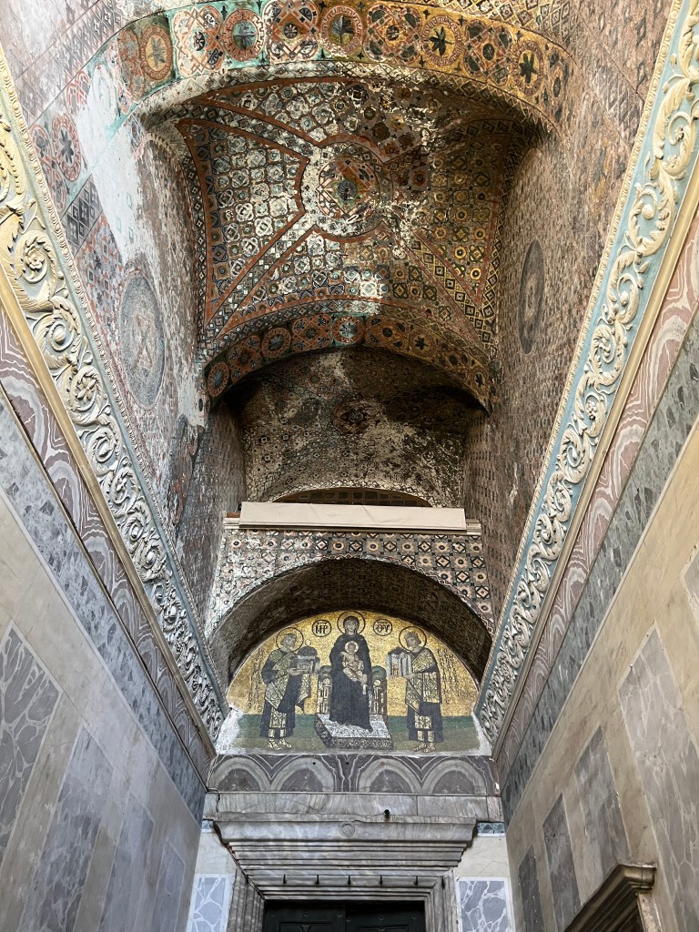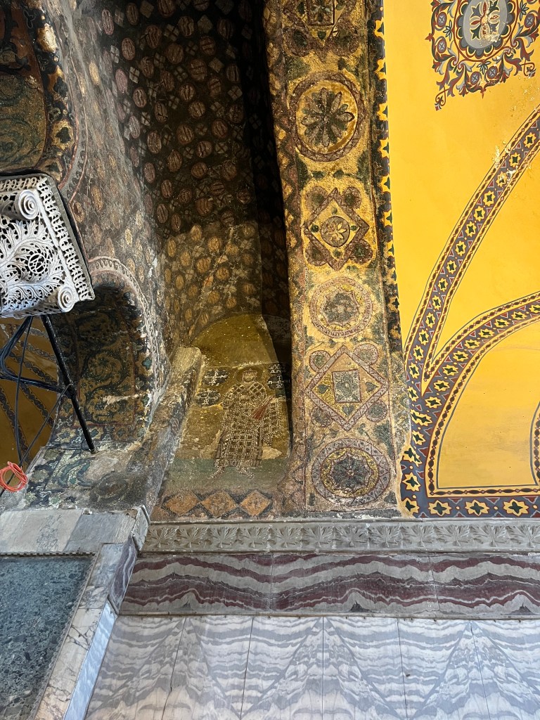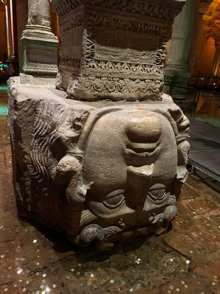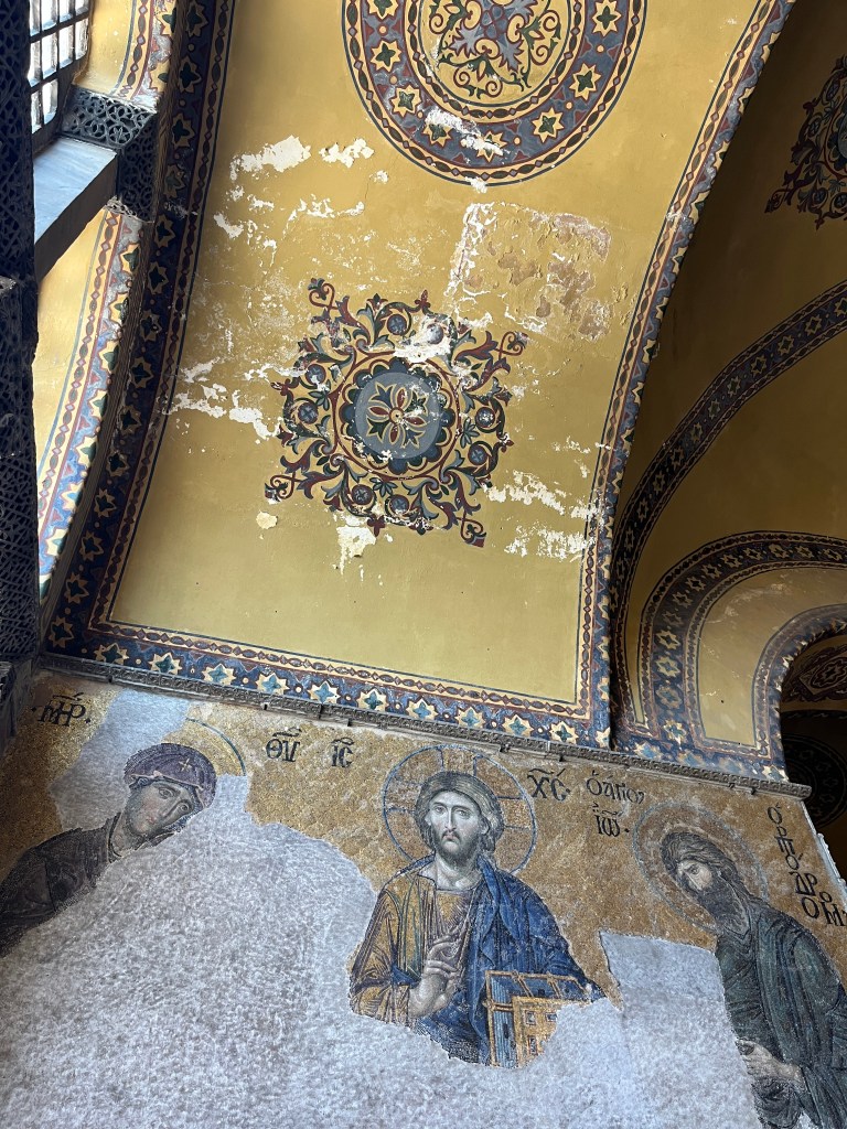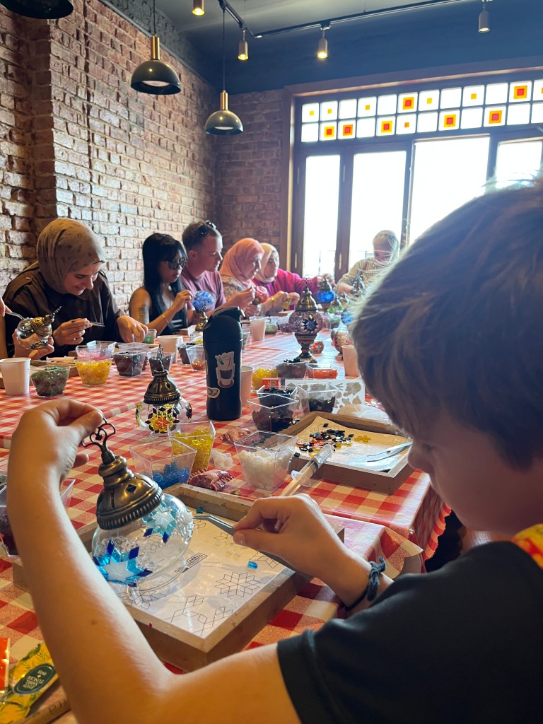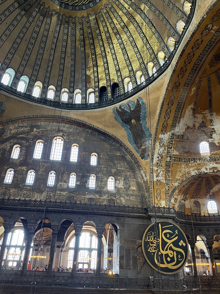 Our little connoisseur of cuisine in now getting into teas, and the Turks sure make them look appealing.We started our first day in Istanbul with a walking-tour. This is the German Fountain – a gift bringing water to the people. Of course, there were politics behind it. Friendly, but strategic ones, intended to increase approval of the German Emperor Kaiser Wilhelm II.This Egyptian Obelisk is the oldest artifact in Istanbul- older than the city itself. (WARNING: History detour ahead.) Emperor Theodosius moved the Obelisk, made in 1736 B.C. by the Pharoah Tutmosis, into the middle of the hippodrome (chariot stadium) in Constantinople near 390 BC. Even the iron braces are left from that era. The base tells a story too. The capital of the Roman Empire had been moved from Rome to what was then known as Byzantium (later Constantinople, then Istanbul) because the city was so well positioned. They called this “New Rome.” Later, when Emperor Theodosius I (centre) died, he gave the eastern and western halves of the Roman Empire to his sons (the children depicted left and right) because the Empire had gotten too large to be ruled by one emperor. After this division, the Roman Empire continued its decline, and Constantinople eventually became Byzantine in culture, which was Christian, Greco-Roman and Persian influenced. (I’m typing this out to get myself straight. I’ve never been great at retaining history. I do better when learning in person though.)Our guide was a cool, local guy.This is not the smile of a boy pumped to learn about a mosque. It’s the smile of a little kid flipping the bird in the famous and glorious Blue Mosque. Sometimes I manage a good framing. This is an ostrich egg hanging here in a golden brace because their scent is believed to ward off spiders and prevent cobwebs in the mosque.This is a big brother loose-tooth consult in the shadow of the Hagia Sofia.The Hagia Sofia we see today was built in 537 CE after many rebuilds and repairs from fires, riots, and earthquakes. In 1453, under the Ottoman Empire, the massive church became a mosque, and the four minarets were added by various emperors. It was turned into a museum in 1934 by secular president Kemal Ataturk, the first president of the modern Turkish Republic. However, in 2020, it was turned back into a muslim house of worship. Inside you can see the famous frescos in the balcony, but visitors are not allowed to enter at the ground level.The Grand Bazaar is filled with men in closet-like shops either looking bored or pumped up to pull off a sale. There are no fixed prices, so the traps are set, but the atmosphere is still jovial. It was more mall-like than I had expected. The word “bazaar” had me thinking market-like tents. It’s a beautiful display of Turkish craftsmanship in any case, and there’s a bustling, consumeristic electricity in the air. It’s a good place to walk in the rain too- 3,600 shops, 64 streets, and 22 entrances. If only I were into shopping…A meatball place recommended by our guide. Corn is for sale as a snack everywhere in the historic areas. The kids eat it up like crazy. It’s cheap and keeps the grumps at bay.Black, grey, white, cream, brown, and navy blue in some combo is the unspoken dress code of Istanbulites. You can spot a tourist by their deviation from the local fashion pallet.There are always kids in a park happy to welcome in new players.Stuff. How much stuff does there need to be in the world? And where are all the humans putting it? And why is it so damn alluring to children and adults alike? Istanbul is full of people displaying and moving stuff around. A post may be simmering on this…This was a common site in our neighbourhood- Fatih. There is a man on the other side of this dolly and a steep hill behind him. More stuff. I prefer the company of dogs, but cats are cool. Can’t deny it. They are the little divas of the animal kingdom. I got to take an early morning walk on my own to a Coffee Making and Fortune Telling class. AirB&B “Experiences” have proven to have some great offerings. (I didn’t notice the “no photography” sign hanging there until after I’d taken this.)We began our class with this tradition. Kolonya is offered when entering a Turkish home, along with a plate of candy. The cologne is rubbed into both sides of the hands and then inhaled to give a sense of refreshment. The candy is to ensure a sweet encounter between hosts and guests.After a lecture about Turkish coffee history, we watched a demo and then did the process ourselves. We hand-ground the beans with the golden-coloured grinder, then placed them in the cezve, the little pot with long handle. We added water, stirring no more than ten times. Then we placed it on the burner. You let it rise up twice. After the first rising, you remove the cezve from the heat and scoop off the bubbly foam and place it in your cup. This will be your fortune.The word for “brown” in Turkish basically means “coffee coloured.” According to the teacher, the various shades of brown follow this coffee comparison in ways such as “coffee with a bit of milk colour” or “double roasted coffee colour.” Socio-linguistics is so fun. We were also informed that if we order a Turkish coffee in a cafe, it should always come with at least one Turkish Delight (or similar sweet) and a glass of water. If not, we are well within our rights to question this gross negligence.After drinking the coffee liquid, you save the famous sludge and “close the cup” (place the saucer on top). Then you swirl it around, making circles, and ask a question or make a wish. Next, you upturn the cup and saucer together and let them sit for ten to twelve minutes. The teacher explained that coffee is really just an excuse for enjoying friendship, and the fortune telling is just a way to share one’s hopes and connect with someone who is valued. You can place an item of your possession on the cup as it sets in order to infu