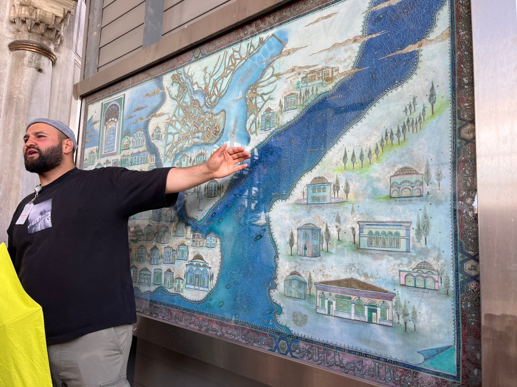 Our Istanbul walking-tour guide indicating the Bosphorus Strait on a map near the Hagia Sofia (Aya Sofia). Europe to the West. Asia to the East. Istanbul is an excellent city for geography lessons.