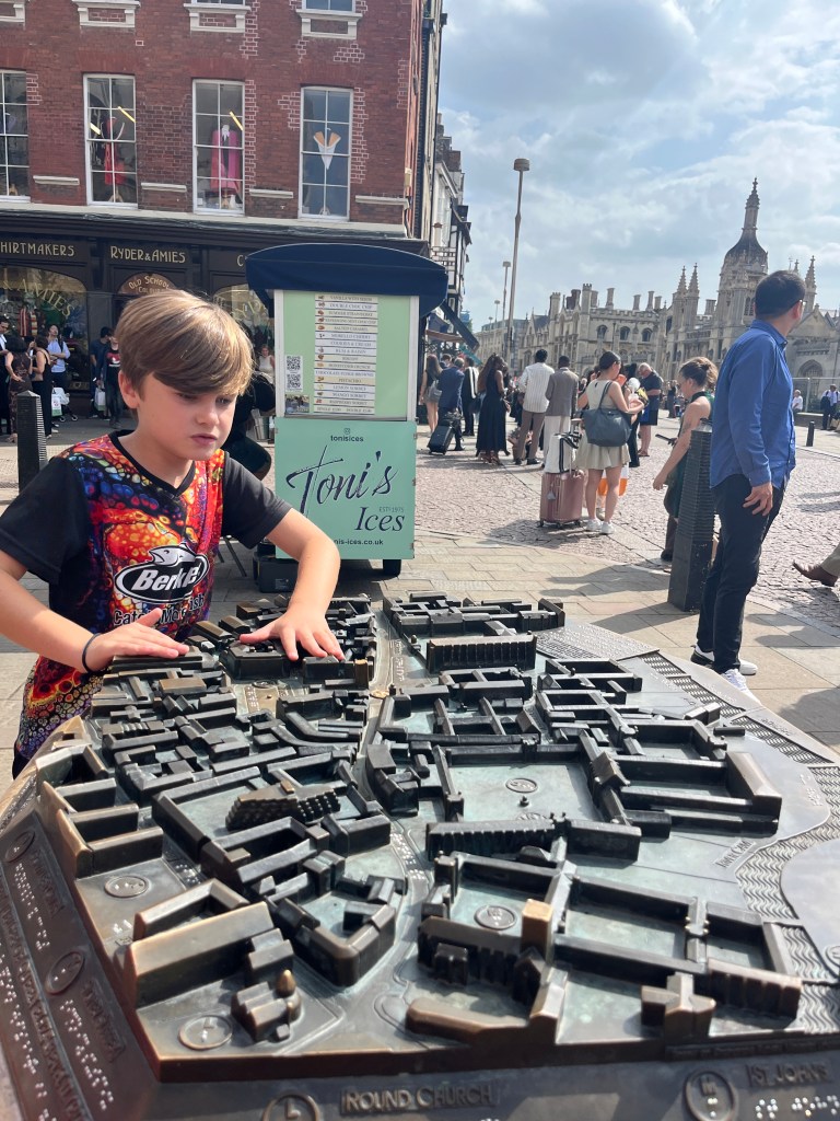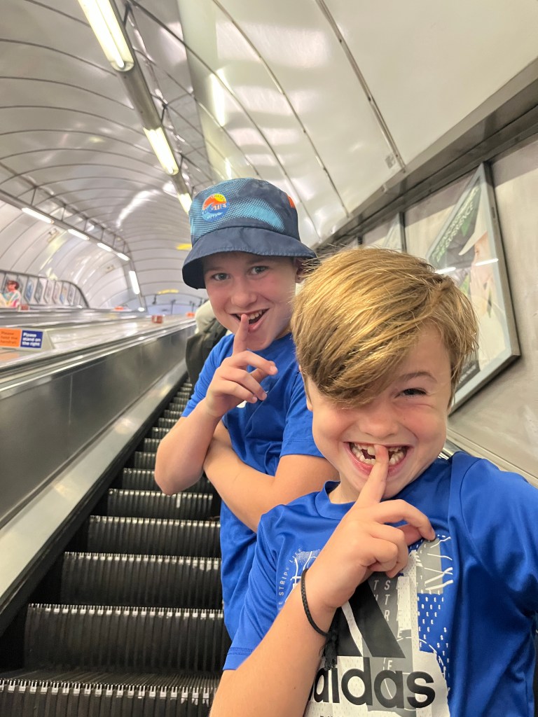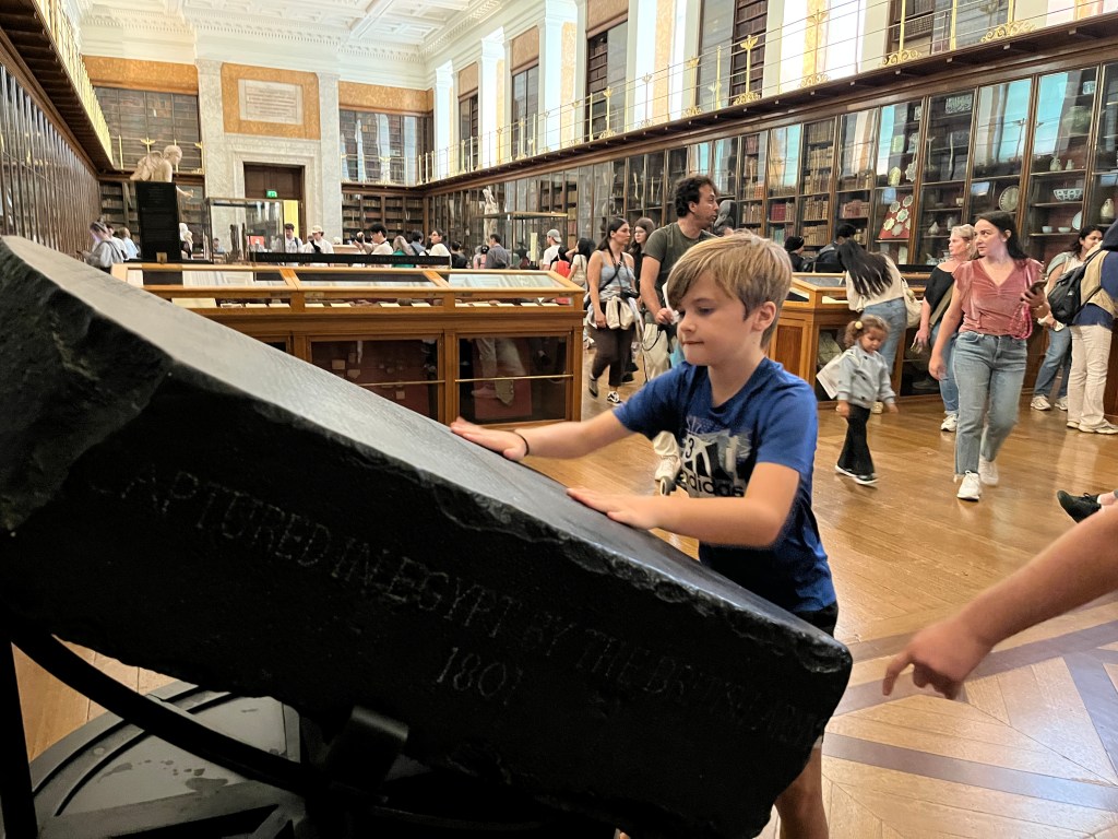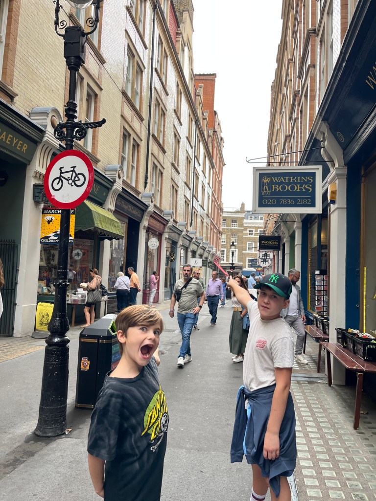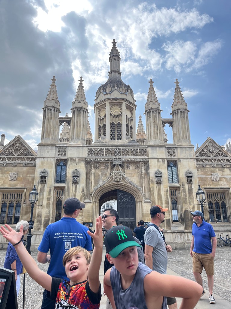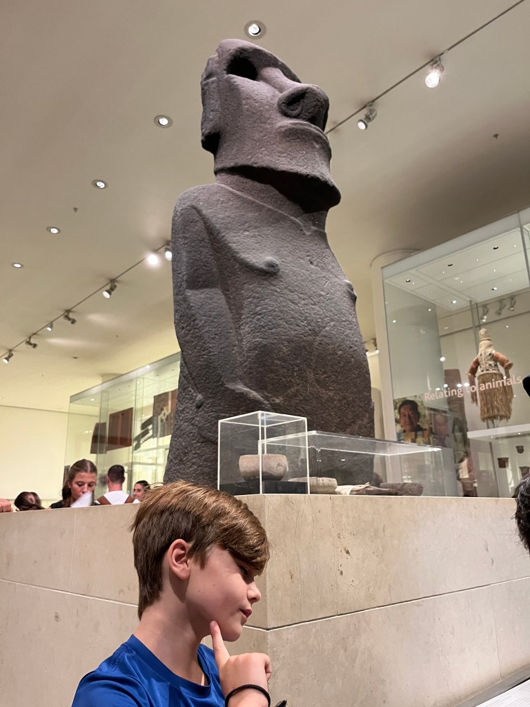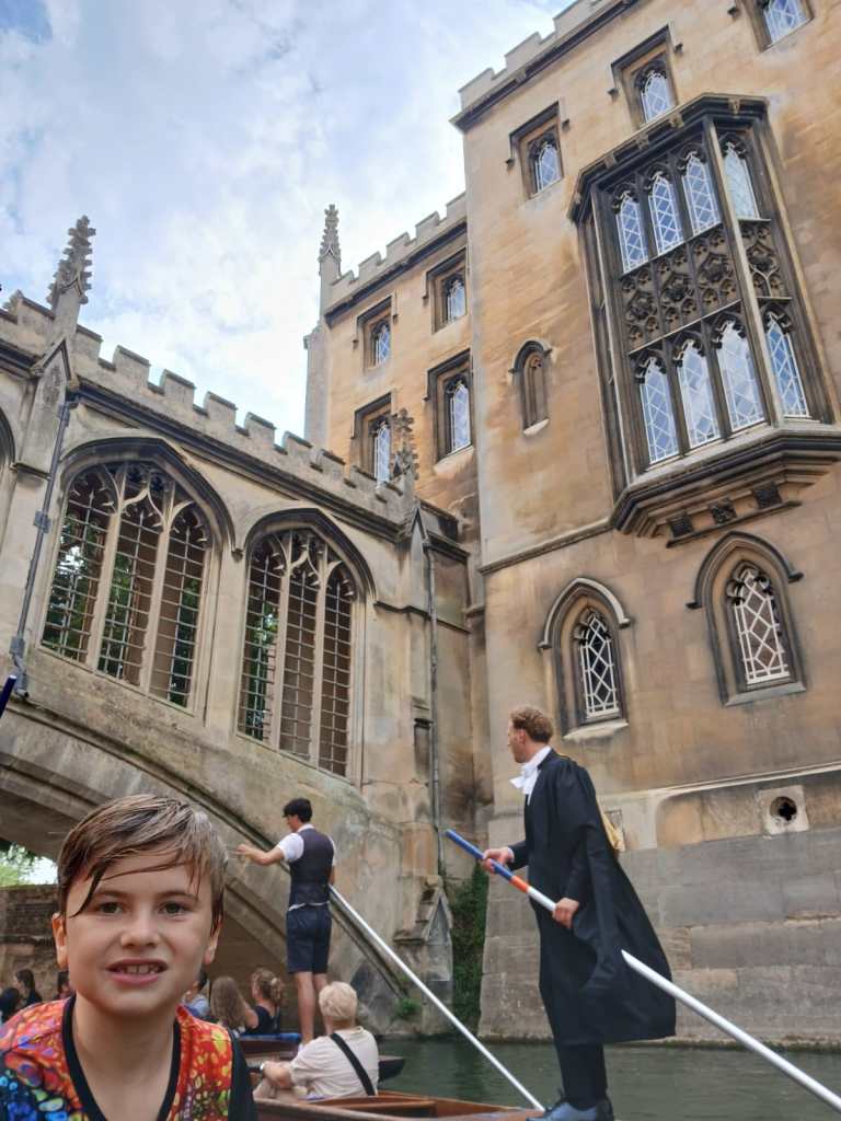 My partner’s uncle and family were a total delight and very skilled at adapting to our rowdy crew… Dougie, the dog, helped bridge the gap in our “normals.”The boys were very impressed that London dogs do 1,000 pound poos.The charming and historic Hammersmith Bridge was walked many time as it take us to the Underground Station. We got to observe the tidal River Thames at many stages.Scary, these two! Good world-schooling to learn how to navigate London’s Underground with its elaborate map. There are a few concepts that are fun to explain and then practice. We’ve been talking about finding our favourite restaurant, Chipotle, for awhile. London is our only stop that has it. It’s like Mecca for our family. A religious experience. As we relished our favourite dishes, we watched London’s kaleidoscope of humanity walk by, and we talked about how small towns and small ponds of all kinds can make you feel like you don’t fit in, but it’s important to always remember that sometimes that just means you haven’t found “your people” yet. Big cities like London are where many people find their groove in life. There are certainly all sorts walking these streets. The boys loved it and might make it a home one day… who knows?Classic shot.The British Museum entrance requires the wide lens.At the admission-free, totally-packed British Museum, we had a nice wander around. This is a replica of The Rosetta Stone, which you are encouraged to touch. “Captured in Egypt by the British Army 1801” and “Presented by King George III” are inscribed on it. We discussed the means by which much of this museum’s collection of artefacts was procured by British imperialism. It fit in with all our conversations about French, British, and Spanish colonialism we’ve discussed so far. I didn’t really understand things like this at their ages. I’m glad they are developing this bigger picture of world history early.The Rossetta Stone itself is famous for helping to decipher Egyptian hieroglyphs because it had the same message in three languages: ancient Greek, Egyptian hieroglyphics, and Demotic. As hieroglyphics had been out of use for centuries, their meaning had been lost, but this message, which was a decree on behalf of King Ptolemy V of Egypt about honouring him and granting privileges by a council of priests (or something), allowed them to unlock the meaning of the mysterious pictographic script. The writing is tiny.I had never really appreciated the jawline of these great stone statues from Easter Island. The Moai, made of monolithic volcanic rock, are still a wonder because their transportation across the island back in 1250-1300 CE is an engineering mystery. And they look cool. They command reverence. Must be the jawline.This guy, who doesn’t want to go anywhere any more, was willing to hit the local Hammersmith pub with me a couple times. Coke and hot chips. Good bonding time. The news imagery on tv about the humanitarian crisis in Palestine gave us some conversation points to consider.Almost as soon as we arrived in London, we drove off to visit some good friends in Cambridge, and our pal there was ready to roll out the red carpet for our crew. Big time. We feasted like kings… better than most kings, I’d wager. These are the massive steaks for our dinner, but first….It was the lunch that untied our shoelaces with total awe and delight! Our friend is an owner of Mercado Central (the dark blue building we are heading towards). It’s a very gourmet Spanish restaurant, and no detail was spared. Wine, dessert, monkfish, Spanish jamon, shrimp, croquetas like we’d never tasted (and probably never will). Wow! This restaurant is seriously skilled at delivering magical dishes. We all agreed it was easily the best meal of the year. Perhaps a lifetime. The Madrid expat crew reunited. Joining us left is my partner’s BBC cameraman and good mate, who is also now in Cambridge. With good friends, the affection flows so easily as if no time has passed. This was such a high point of our trip. (My partner has a moustache at the request of the boys. It is gone now.)And our boys are so good at jumping into the adult friend vibe. I knew these two would hit it off. After our amazing lunch, we had Cambridge to conquer. Clearly, they were born for such endeavours. A bicycle helped get the little one rolling again. Feet dragging is a literal thing with him.Punting is something I’d never heard of. It was described like the canal boats in Venice being propelled by a driver with a long stick. That’s what it was. While our boat was booked, some of us watched watercolour landscapes emerge from blank paper. I’m not sure our observance was completely welcomed, but the boys offered lots of praise and delight!At least one among us knew how to captain the “punt” (boat). Thank goodness.Happy to be a passenger.Punting is a beautiful way to see the buildings and bridges of Cambridge. “The College Backs” they are called.You see. Very enjoyable.Until your wild children decide it is much more enjoyable to jump into the water and swim around a bit, boarding other people’s punts, dancing on the front of ours, and starting splash fights with other more lively punt crews.It was quite the experience to be, once again, the mother of “that family.”The boys were, as always, very good at chatting people up. The man behind us was punting around his parents who were visiting for his graduation for his physics doctorate. The boys chatted with this scholar as if he were a soccer mate.Back at the house, our gourmet-lifestyled friend rolled out the second act of culinary delights.Our eldest was keen to learn all he could.A dragonfly needed rescuing from the skylight… and I could see all of these men as their 13-year-old selves in this moment. What beautiful humans to reunite with. Now we just have to plot the next reunion… which seems impossible to fathom at this point. Unless they come to us! (hin