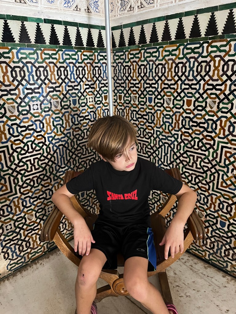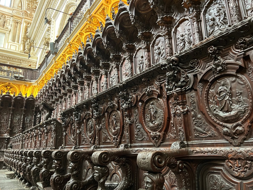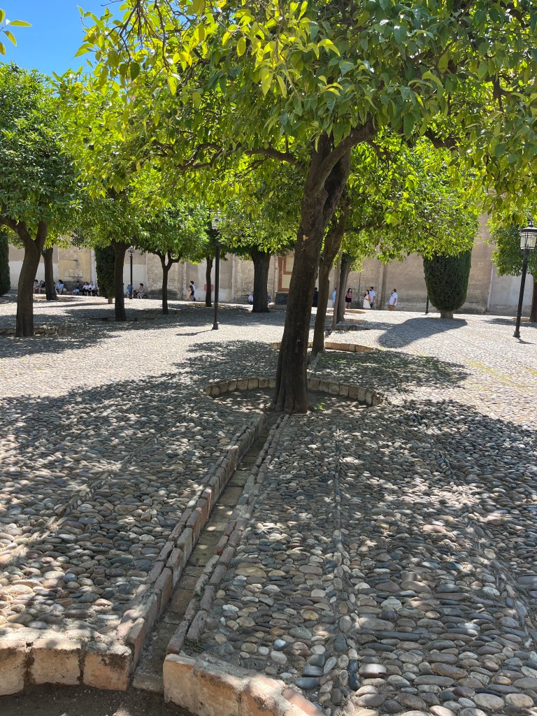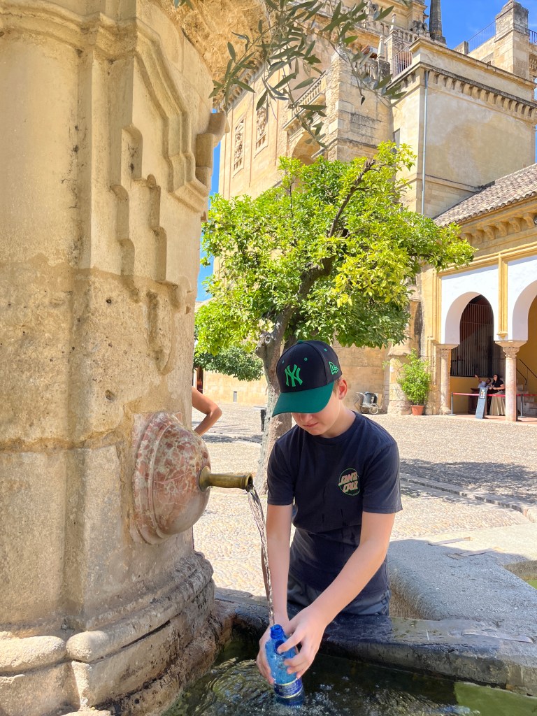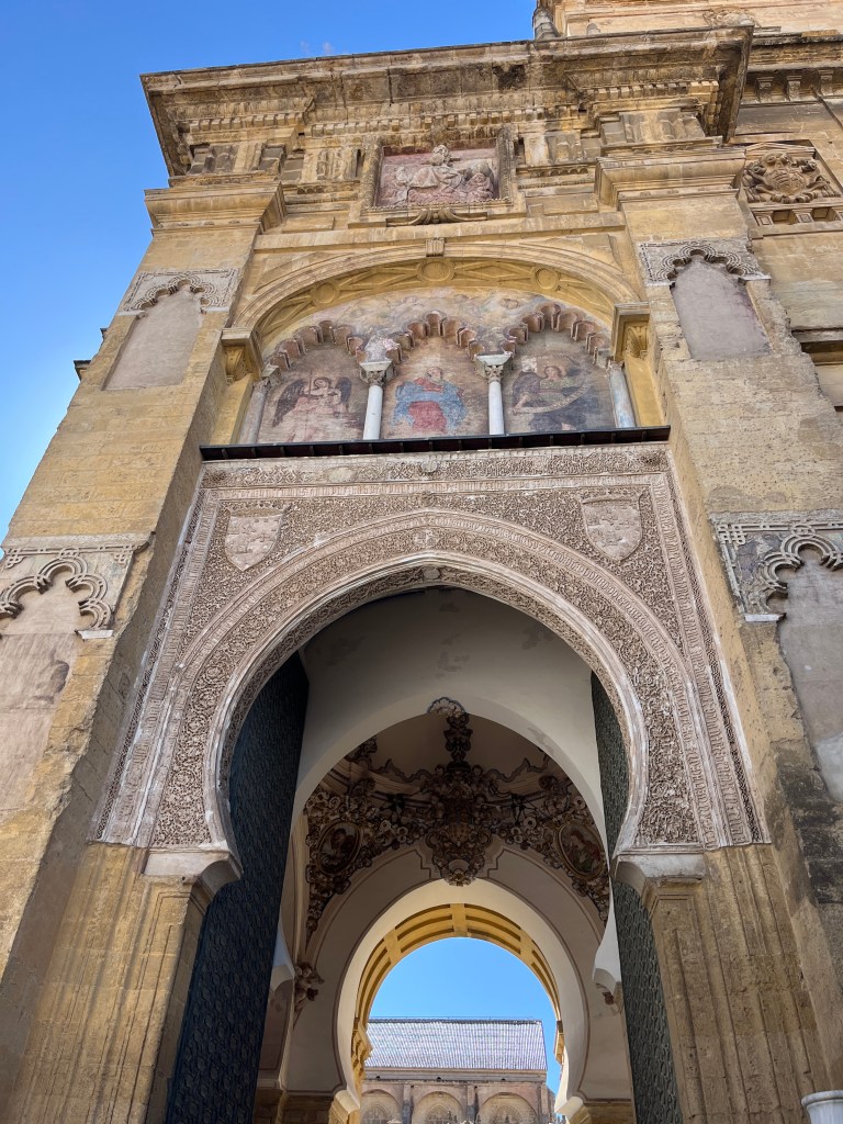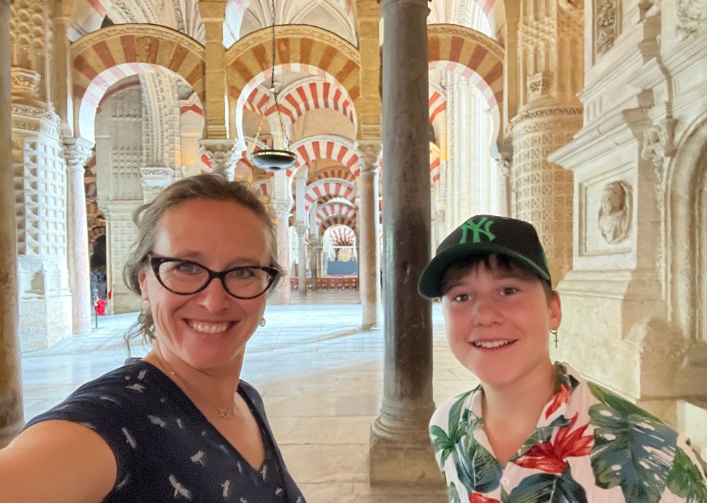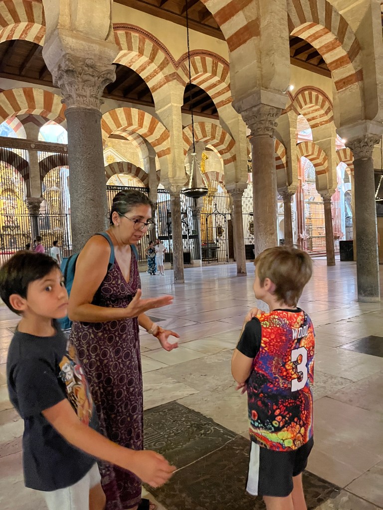We have been houseguests in Germany, England, Norway, and now Spain, thanks to a beautiful family we have not seen in over a decade. We were very warmly welcomed by our friends in Córdoba last week, and their efforts to show us the beauties of their city and the delights of their cuisine were humbling. If we weren’t before, we are certainly in karmic debt now after all the generosity poured into us under this roof. We had no idea we were so wealthy in the friendship department- another argument in the case for travel’s worth.“Córdoba is a walking city,” our hosts informed us. It was excellent walking and superb chatting with like-minded souls in this golden-hued town. The boys spotted my partner’s moonlighting alter ego- “Blind Guardian”… There is a joke to be made… but I won’t be the one to make it.Chats in Spanglish- everyone wins!The patios of Córdoba are a big deal. These interior courtyards of homes often have a central fountain or well and are surrounded by whitewashed walls covered with plants and flowers. Patios started in Roman times, but the Islamic chapter of history embraced these refreshing hearts of the home, as well. Now, there is a festival each May in Córdoba when all the doors open, and people tour these hidden and historic oases.During our autumn visit, there weren’t many blooms, but these shady, plant-filled spaces were still a cooling respite from the heat of the stark and treeless streets.The main entry to the Mezquita, which is the mosque-cathedral one must visit in Córdoba, is called The Gate of Forgiveness (La Puerta del Perdon). Now, it is the entry to the Patio of the Oranges, the first spectacular space you enter on the Mezquita grounds. In the past, for pilgrims, this massive doorway was an important threshold in the path towards absolution. I think I stifled some grump at my kids on my way through. That felt divinely influenced.You can see the dual religious history of the mosque-cathedral in this doorway of forgiveness. Both Islamic and Renaissance architecture are obvious. This is emblematic of the whole site of the Mezquita. The Moors invaded Spain across the Straight of Gibraltar in 711, taking over the Visigoth Kingdom that had moved in when the Roman Empire fell. Parts of southern Spain were occupied by the Moors from 711 until the completion of the long-fought Christian Reconquista in 1492- the same year “Christopher Columbus sailed the ocean blue.” A good year for the Spaniards.The Mezquita is a fantastic fusion of these religious architectural styles. It is a stunning, rambling, quirky jumble of spiritually-inspired masterpieces. What a spectacular house of worship. It captures how I feel about organised religion. We are all praying beautifully to the same god. We just have our different styles.Columns were often repurposed from other places in the past. Many of the over 850 columns in the Mezquita were no different. They are made of various types of stone (marble, jasper, granite), and some even have special stories, but they are all quite short in stature. One of the most remarkable features of this building is how these squat columns were fitted with double arches to provide greater height and illumination in the prayer space. This innovation creates a unique tree-like effect, as if you are walking through “a forest of columns.” I think you can sense it in the photos.I couldn’t find anything to explain why they are pattered in alternating red brick and white limestone, except for one source that says this repetitive pattern offers a sense of “Allah’s unending nature.” It is certainly distinctive, and it was probably just made of materials that were on hand in abundance.We all deeply appreciated it, you can imagine.Our friends were such good teachers- very knowledgeable and ready to share stories with us. I wish we had had all day to take this space in. This was my second trip to the Mezquita, but I still feel like I didn’t get all I should out of the experience. It is so dense with artistic genius and spiritual messaging. I guess I’ll have to go back again. And probably again.An internal cemetery. All I had attention for was the coloured light of the stained glass window. Next visit…In 1236, a cathedral was built inside the Great Mosque of Córdoba- The Cathedral of Our Lady of Assumption. One of our friends sang here regularly as a child. What must that have been like?These finely carved mahogany choir stalls were very impressive. After our big outing, some lazing about was in order. We hit the pool and then popped on the latest Mission Impossible- in Spanish. We soon had siestas in full effect.A serious siesta schedule is honoured in our friends’ apartment building. Quiet hours 3-5pm.The next day, we visited another Córdoba patio with preserved well, kitchen, and washing room. Water is still running in the well after hundreds of years.The Spanish flag has a the coat of arms, which represents the historical Spanish kingdoms: Castile (castle), León (lion), Aragon (4 red bars), Navarre (golden chains), and Granada (pomegranate). The royal crown symbolises the modern monarchy. The motto “Plus Ultra” means “further beyond” in Latin and indicates Spain’s explorations beyond the known world. The red and yellow colours were chosen for their ability to be recognised easily at sea on Spain’s naval fleets. Some say they represent the blood and gold of La Reconquista.Our trip back into town brought us to a fine water source within the Patio of Oranges.Ancient irrigation for the orange trees.Olive trees can live for thousands of years. And some of them look their age. Wonder how old this guy is.La Calle de Los Flores – The Street of Flowers is in the heart of the Jewish Quarter. It’s probably more flowery in other seasons. Having the leg of a pig just sitting in the corner is common around here. The curing of pork was a practice introduced by the Romans, making a cheap and sustainable food
