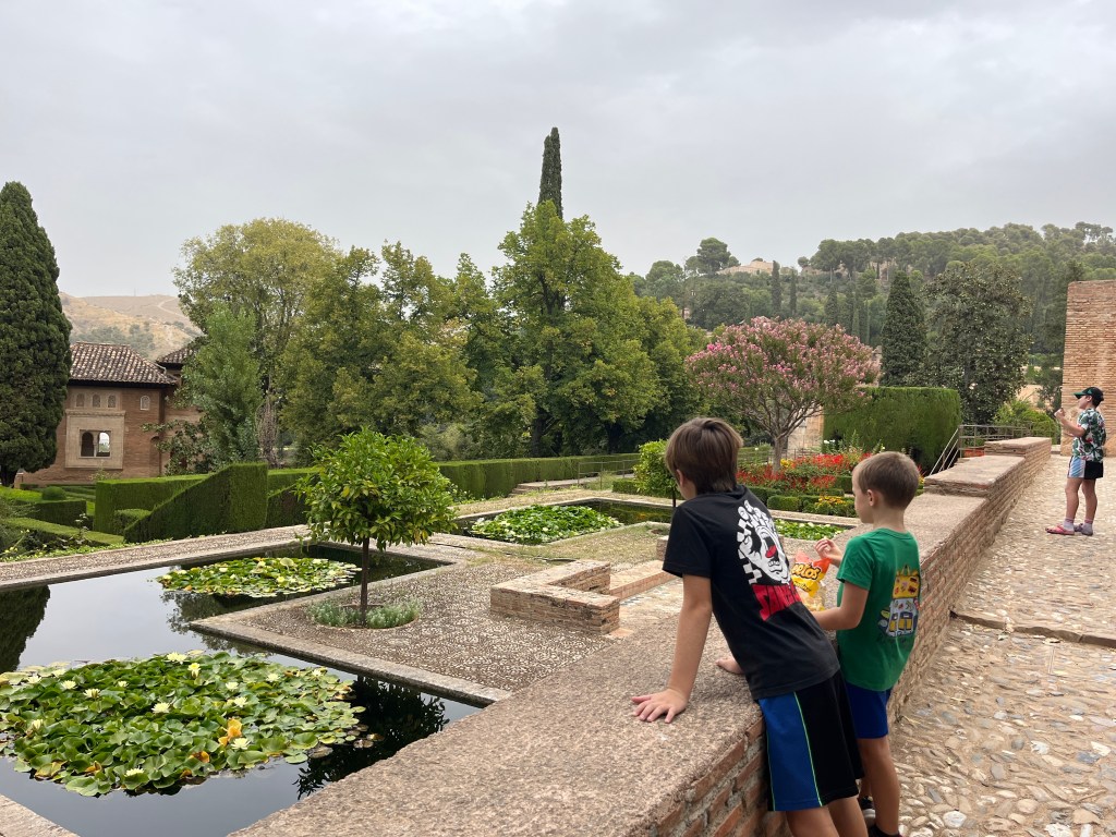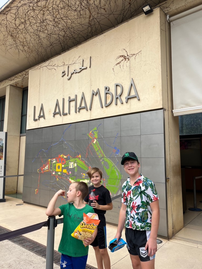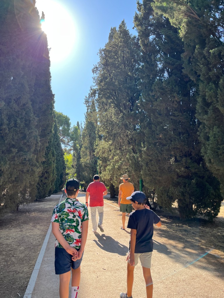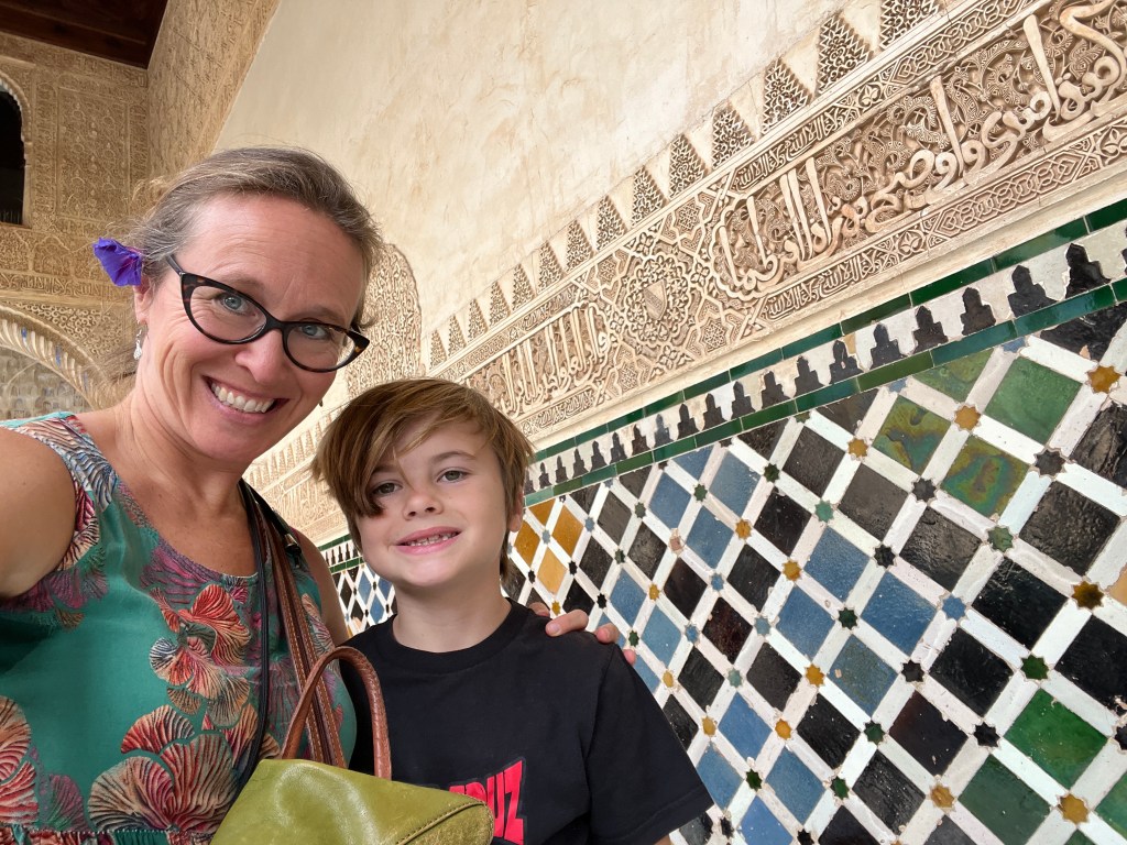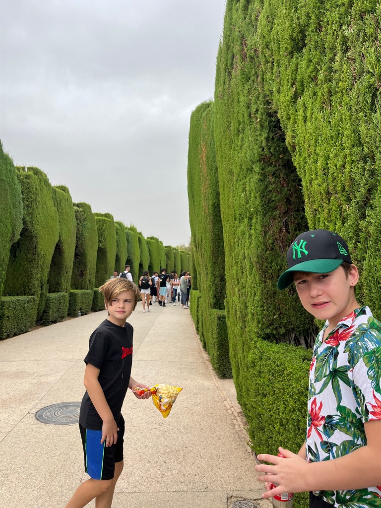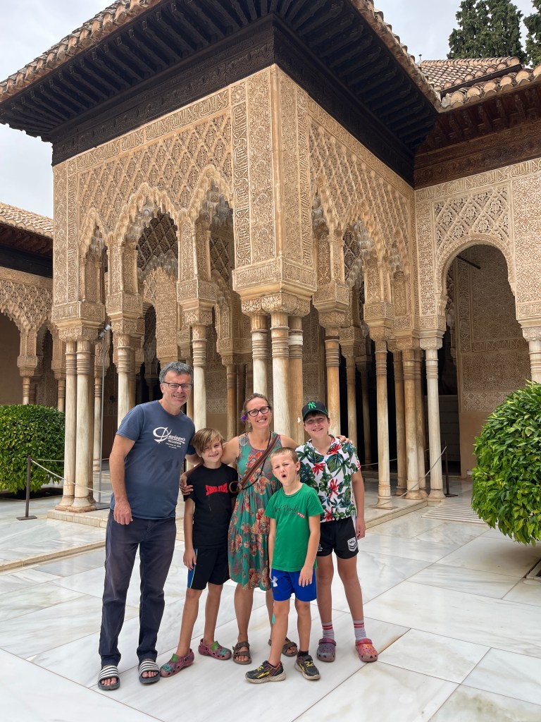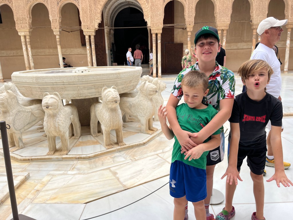 We have been houseguests in Germany, England, Norway, and now Spain, thanks to a beautiful family we have not seen in over a decade. We were very warmly welcomed by our friends in Córdoba last week, and their efforts to show us the beauties of their city and the delights of their cuisine were humbling. If we weren’t before, we are certainly in karmic debt now after all the generosity poured into us under this roof. We had no idea we were so wealthy in the friendship department- another argument in the case for travel’s worth.“Córdoba is a walking city,” our hosts informed us. It was excellent walking and superb chatting with like-minded souls in this golden-hued town. The boys spotted my partner’s moonlighting alter ego- “Blind Guardian”… There is a joke to be made… but I won’t be the one to make it.Chats in Spanglish- everyone wins!The patios of Córdoba are a big deal. These interior courtyards of homes often have a central fountain or well and are surrounded by whitewashed walls covered with plants and flowers. Patios started in Roman times, but the Islamic chapter of history embraced these refreshing hearts of the home, as well. Now, there is a festival each May in Córdoba when all the doors open, and people tour these hidden and historic oases.During our autumn visit, there weren’t many blooms, but these shady, plant-filled spaces were still a cooling respite from the heat of the stark and treeless streets.The main entry to the Mezquita, which is the mosque-cathedral one must visit in Córdoba, is called The Gate of Forgiveness (La Puerta del Perdon). Now, it is the entry to the Patio of the Oranges, the first spectacular space you enter on the Mezquita grounds. In the past, for pilgrims, this massive doorway was an important threshold in the path towards absolution. I think I stifled some grump at my kids on my way through. That felt divinely influenced.You can see the dual religious history of the mosque-cathedral in this doorway of forgiveness. Both Islamic and Renaissance architecture are obvious. This is emblematic of the whole site of the Mezquita. The Moors invaded Spain across the Straight of Gibraltar in 711, taking over the Visigoth Kingdom that had moved in when the Roman Empire fell. Parts of southern Spain were occupied by the Moors from 711 until the completion of the long-fought Christian Reconquista in 1492- the same year “Christopher Columbus sailed the ocean blue.” A good year for the Spaniards.The Mezquita is a fantastic fusion of these religious architectural styles. It is a stunning, rambling, quirky jumble of spiritually-inspired masterpieces. What a spectacular house of worship. It captures how I feel about organised religion. We are all praying beautifully to the same god. We just have our different styles.Columns were often repurposed from other places in the past. Many of the over 850 columns in the Mezquita were no different. They are made of various types of stone (marble, jasper, granite), and some even have special stories, but they are all quite short in stature. One of the most remarkable features of this building is how these squat columns were fitted with double arches to provide greater height and illumination in the prayer space. This innovation creates a unique tree-like effect, as if you are walking through “a forest of columns.” I think you can sense it in the photos.I couldn’t find anything to explain why they are pattered in alternating red brick and white limestone, except for one source that says this repetitive pattern offers a sense of “Allah’s unending nature.” It is certainly distinctive, and it was probably just made of materials that were on hand in abundance.We all deeply appreciated it, you can imagine.Our friends were such good teachers- very knowledgeable and ready to share stories with us. I wish we had had all day to take this space in. This was my second trip to the Mezquita, but I still feel like I didn’t get all I should out of the experience. It is so dense with artistic genius and spiritual messaging. I guess I’ll have to go back again. And probably again.An internal cemetery. All I had attention for was the coloured light of the stained glass window. Next visit…In 1236, a cathedral was built inside the Great Mosque of Córdoba- The Cathedral of Our Lady of Assumption. One of our friends sang here regularly as a child. What must that have been like?These finely carved mahogany choir stalls were very impressive. After our big outing, some lazing about was in order. We hit the pool and then popped on the latest Mission Impossible- in Spanish. We soon had siestas in full effect.A serious siesta schedule is honoured in our friends’ apartment building. Quiet hours 3-5pm.The next day, we visited another Córdoba patio with preserved well, kitchen, and washing room. Water is still running in the well after hundreds of years.The Spanish flag has a the coat of arms, which represents the historical Spanish kingdoms: Castile (castle), León (lion), Aragon (4 red bars), Navarre (golden chains), and Granada (pomegranate). The royal crown symbolises the modern monarchy. The motto “Plus Ultra” means “further beyond” in Latin and indicates Spain’s explorations beyond the known world. The red and yellow colours were chosen for their ability to be recognised easily at sea on Spain’s naval fleets. Some say they represent the blood and gold of La Reconquista.Our trip back into town brought us to a fine water source within the Patio of Oranges.Ancient irrigation for the orange trees.Olive trees can live for thousands of years. And some of them look their age. Wonder how old this guy is.La Calle de Los Flores – The Street of Flowers is in the heart of the Jewish Quarter. It’s probably more flowery in other seasons. Having the leg of a pig just sitting in the corner is common around here. The curing of pork was a practice introduced by the Romans, making a cheap and sustainable food